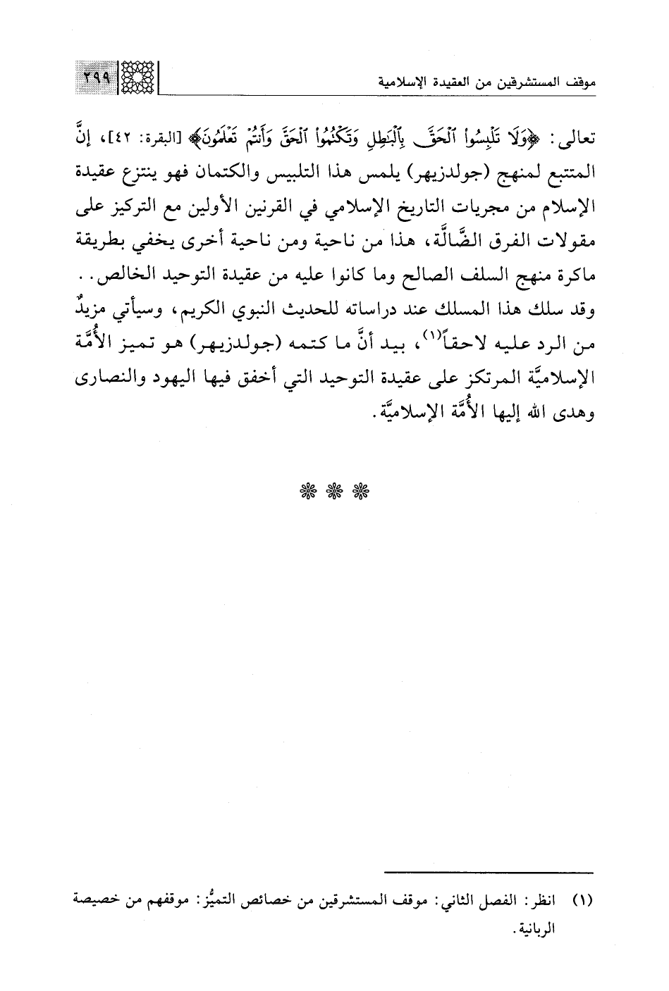 تعالى: {وَلَا تَلْبِسُوا الْحَقَّ بِالْبَاطِلِ وَتَكْتُمُوا الْحَقَّ وَأَنْتُمْ تَعْلَمُونَ} [البقرة: 42]، إنَّ المتتبع لمنهج (جولدزيهر) يلمس هذا التلبيس والكتمان فهو ينتزع عقيدة الإسلام من مجريات التاريخ الإسلامي في القرنين الأولين مع التركيز على مقولات الفرق الضَّالَّة، هذا من ناحية ومن ناحية أخرى يخفي بطريقة ماكرة منهج السلف الصالح وما كانوا عليه من عقيدة التوحيد الخالص. . وقد سلك هذا المسلك عند دراساته للحديث النبوي الكريم، وسيأتي مزيدٌ من الرد عليه لاحقًا (¬1)، بيد أنَّ ما كتمه (جولدزيهر) هو تميُّز الأُمَّة الإسلاميَّة المرتكز على عقيدة التوحيد التي أخفق فيها اليهود والنصارى وهدى اللَّه إليها الأُمَّة الإسلاميَّة.
