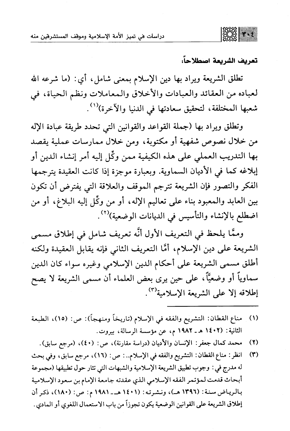 (¬3) انظر: مناع القطان: التشريع والفقه في الإسلام. .: ص: (16)، مرجع سابق، وفي بحث له مدرج في: وجوب تطبيق الشريعة الإسلامية والشبهات التي تثار حول تطبيقها (مجموعة أبحاث قدمت لمؤتمر الفقه الإسلامي الذي عقدته جامعة الإمام بن سعود الإسلامية بالرياض سنة: (1396 هـ)، ونشرته: (1451 هـ - 1981 م) ص: (180)، ذكر أن إطلاق الشريعة على القوانين الوضعية يكون تجوزًا من باب الاستعمال اللغوي أو المادي.