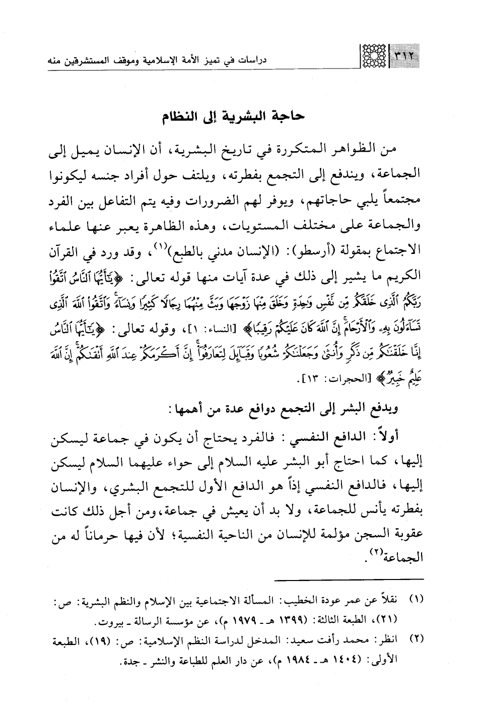 من الظواهر المتكررة في تاريخ البشرية، أن الإنسان يميل إلى الجماعة، ويندفع إلى التجمع بفطرته، ويلتف حول أفراد جنسه ليكونوا مجتمعًا يلبي حاجاتهم، ويوفر لهم الضرورات وفيه يتم التفاعل بين الفرد والجماعة على مختلف المستويات، وهذه الظاهرة يعبر عنها علماء الاجتماع بمقولة (أرسطو): (الإنسان مدني بالطبع) (¬1)، وقد ورد في القرآن الكريم ما يشير إلى ذلك في عدة آيات منها قوله تعالى: {يَاأَيُّهَا النَّاسُ اتَّقُوا رَبَّكُمُ الَّذِي خَلَقَكُمْ مِنْ نَفْسٍ وَاحِدَةٍ وَخَلَقَ مِنْهَا زَوْجَهَا وَبَثَّ مِنْهُمَا رِجَالًا كَثِيرًا وَنِسَاءً وَاتَّقُوا اللَّهَ الَّذِي تَسَاءَلُونَ بِهِ وَالْأَرْحَامَ إِنَّ اللَّهَ كَانَ عَلَيْكُمْ رَقِيبًا} [النساء: 1]، وقوله تعالى: {يَاأَيُّهَا النَّاسُ إِنَّا خَلَقْنَاكُمْ مِنْ ذَكَرٍ وَأُنْثَى وَجَعَلْنَاكُمْ شُعُوبًا وَقَبَائِلَ لِتَعَارَفُوا إِنَّ أَكْرَمَكُمْ عِنْدَ اللَّهِ أَتْقَاكُمْ إِنَّ اللَّهَ عَلِيمٌ خَبِيرٌ} [الحجرات: 13].