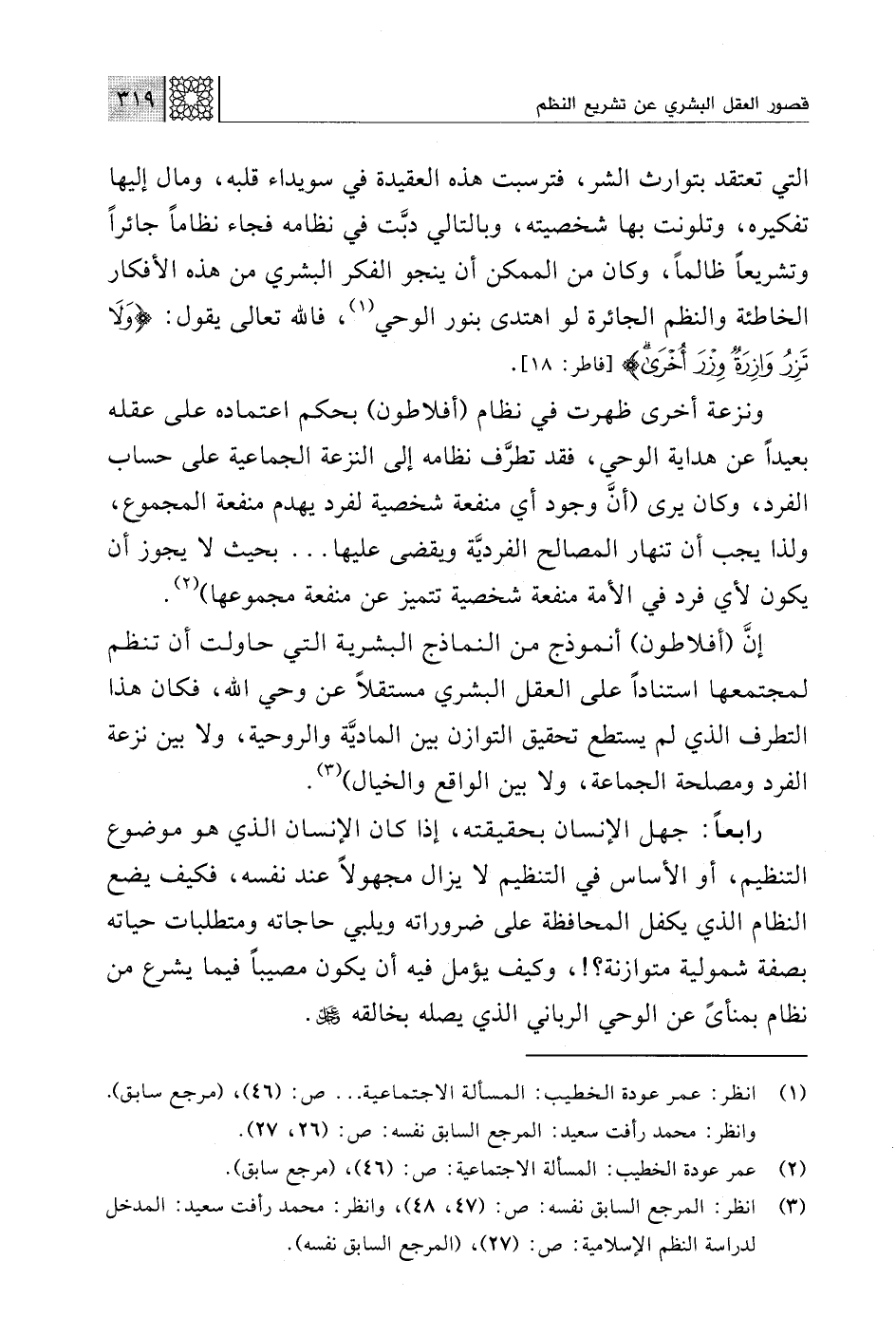 إنَّ (أفلاطون) أنموذج من النماذج البشرية التي حاولت أن تنظم لمجتمعها استنادًا على العقل البشري مستقلًا عن وحي اللَّه، فكان هذا التطرف الذي لم يستطع تحقيق التوازن بين الماديَّة والروحية، ولا بين نزعة الفرد ومصلحة الجماعة، ولا بين الواقع والخيال) (¬3).