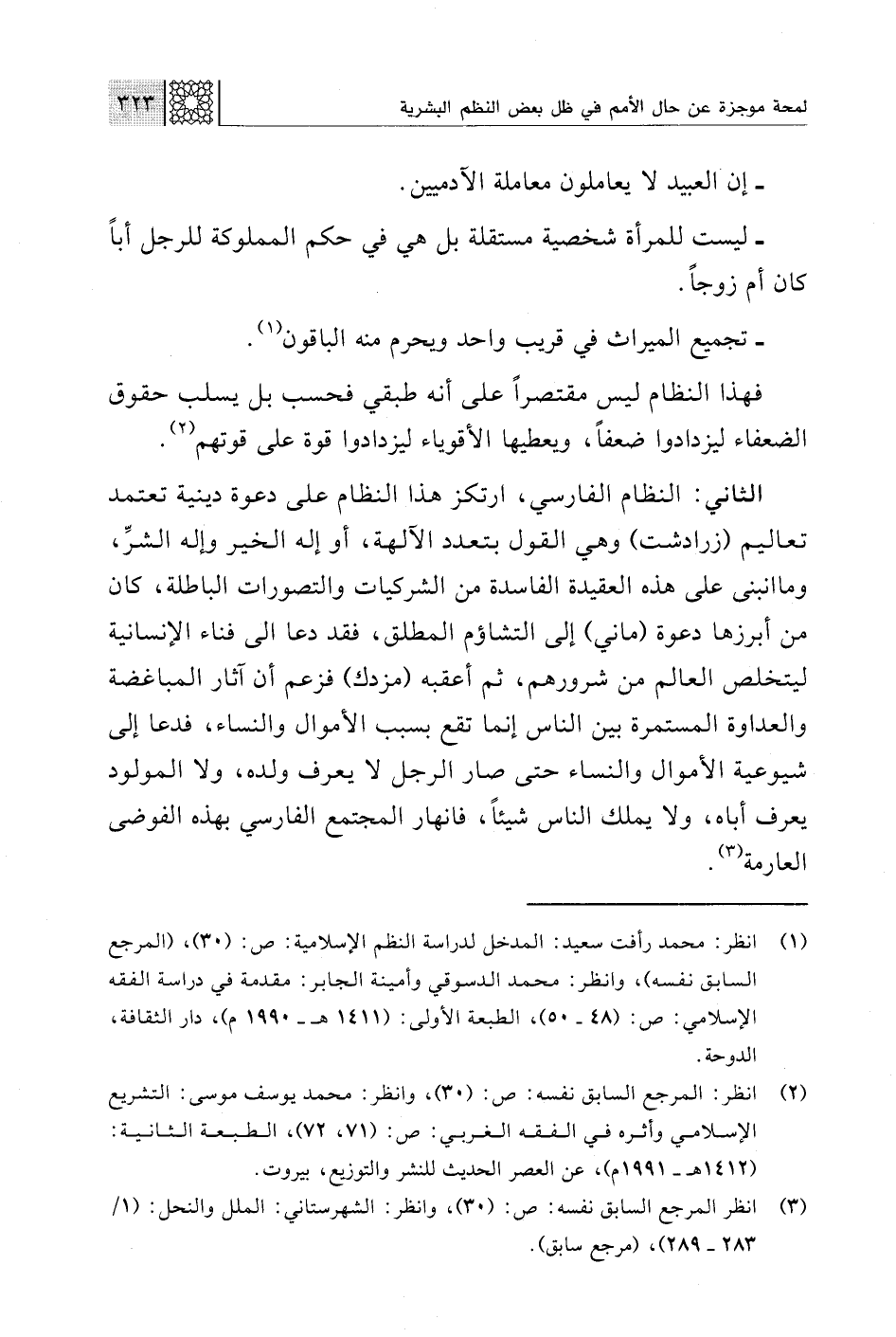 الثاني: النظام الفارسي، ارتكز هذا النظام على دعوة دينية تعتمد تعاليم (زرادشت) وهي القول بتعدد الآلهة، أو إله الخير وإله الشرِّ، وما انبنى على هذه العقيدة الفاسدة من الشركيات والتصورات الباطلة، كان من أبرزها دعوة (ماني) إلى التشاؤم المطلق، فقد دعا الى فناء الإنسانية ليتخلص العالم من شرورهم، ثم أعقبه (مزدك) فزعم أن آثار المباغضة والعداوة المستمرة بين الناس إنما تقع بسبب الأموال والنساء، فدعا إلى شيوعية الأموال والنساء حتى صار الرجل لا يعرف ولده، ولا المولود يعرف أباه، ولا يملك الناس شيئًا، فانهار المجتمع الفارسي بهذه الفوضى العارمة (¬3).