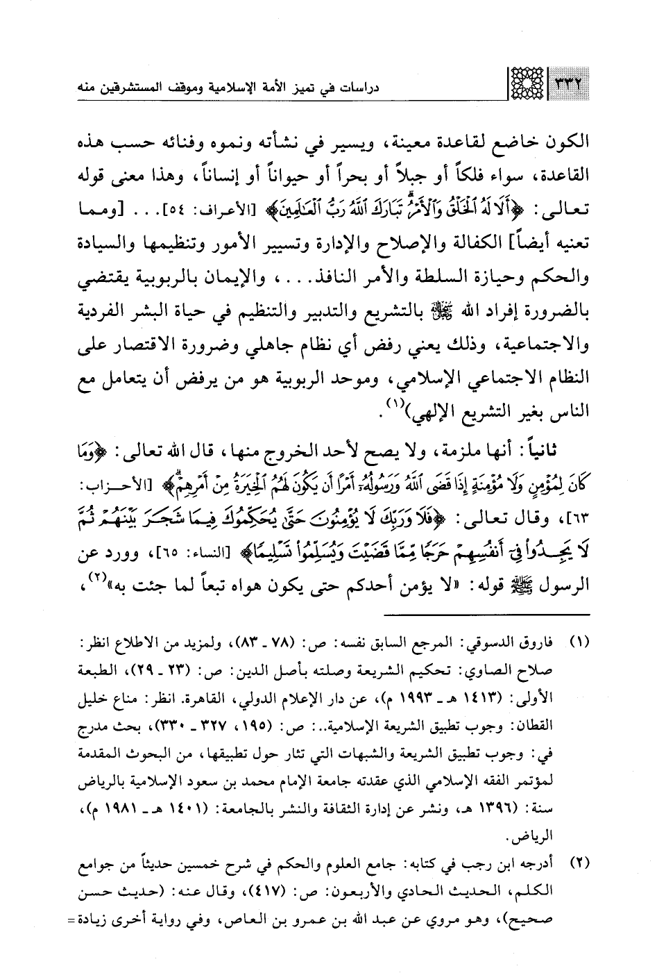 (¬1) فاروق الدسوقي: المرجع السابق نفمه: ص: (78 - 83)، ولمزيد من الاطلاع انظر: صلاح الصاوي: تحكيم الشريعة وصلته بأصل الدين: ص: (23 - 29)، الطبعة الأولى: (1413 هـ - 1993 م)، عن دار الإعلام الدولي، القاهرة. انظر: مناع خليل القطان: وجوب تطبيق الشريعة الإسلامية. .: ص: (195، 327 - 330)، بحث مدرج في: وجوب تطبيق الشريعة والشبهات التي تثار حول تطبيقها، من البحوث المقدمة لمؤتمر الفقه الإسلامي الذي عقدته جامعة الإمام محمد بن سعود الإسلامية بالرياض سنة: (1396 هـ) ونشر عن إدارة الثقافة والنشر بالجامعة: (1451 هـ - 1981 م)، الرياض.