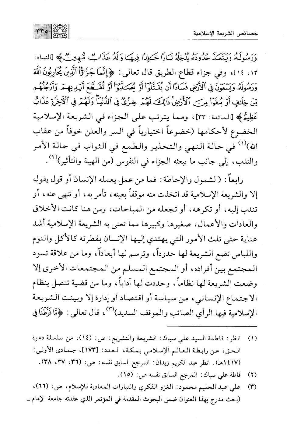 (¬1) انظر: فاطمة السيد علي سباك: الشريعة والتشريع: ص: (14)، من سلسلة دعوة الحق، عن رابطة العالم الإسلامي بمكة، العدد: [173]، جمادى الأولى: (1417 هـ). انظر عبد الكريم زيدان: المرجع السابق نفسه: ص: (36، 37، 38).