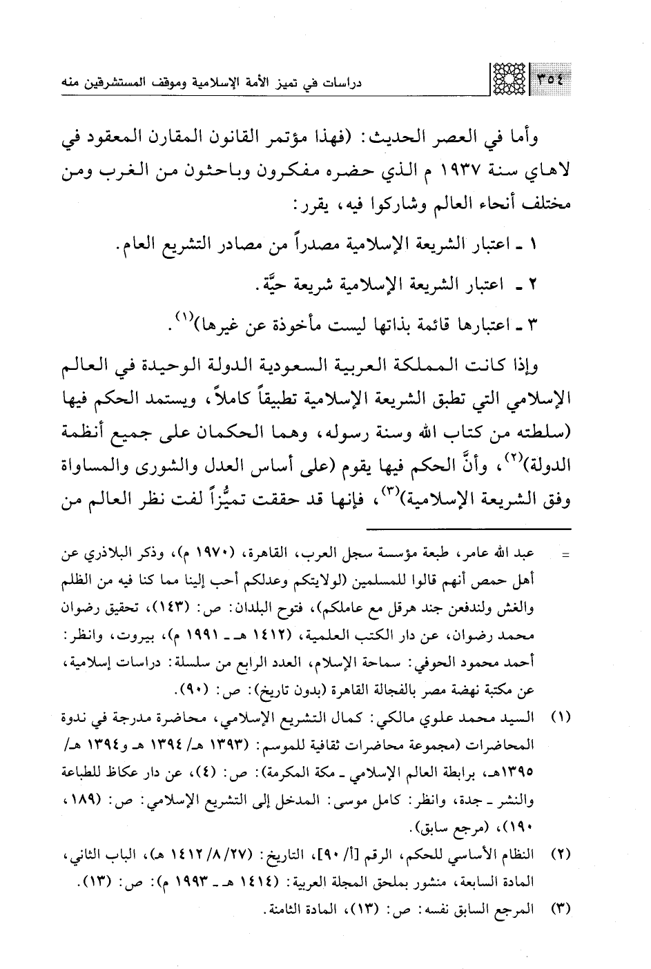 وأما في العصر الحديث: (فهذا مؤتمر القانون المقارن المعقود في لاهاي سنة 1937 م الذي حضره مفكرون وباحثون من الغرب ومن مختلف أنحاء العالم وشاركوا فيه، يقرر: