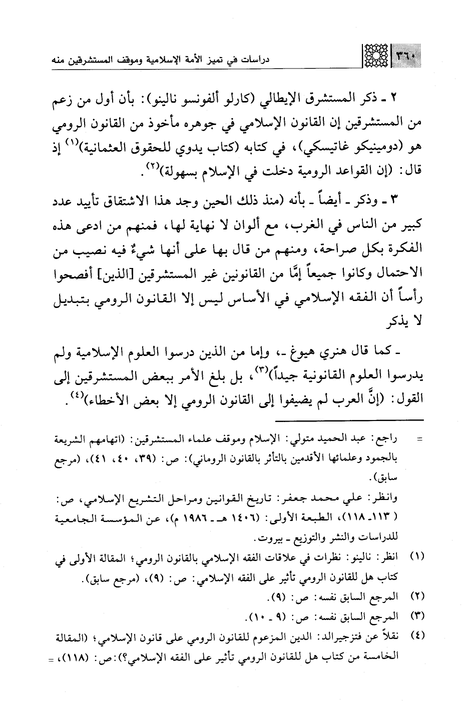 (¬1) انظر: نالينو: نظرات في علاقات الفقه الإسلامي بالقانون الرومي؛ المقالة الأولى في كتاب هل للقانون الرومي تأثير على الفقه الإسلامي: ص: (9)، (مرجع سابق).