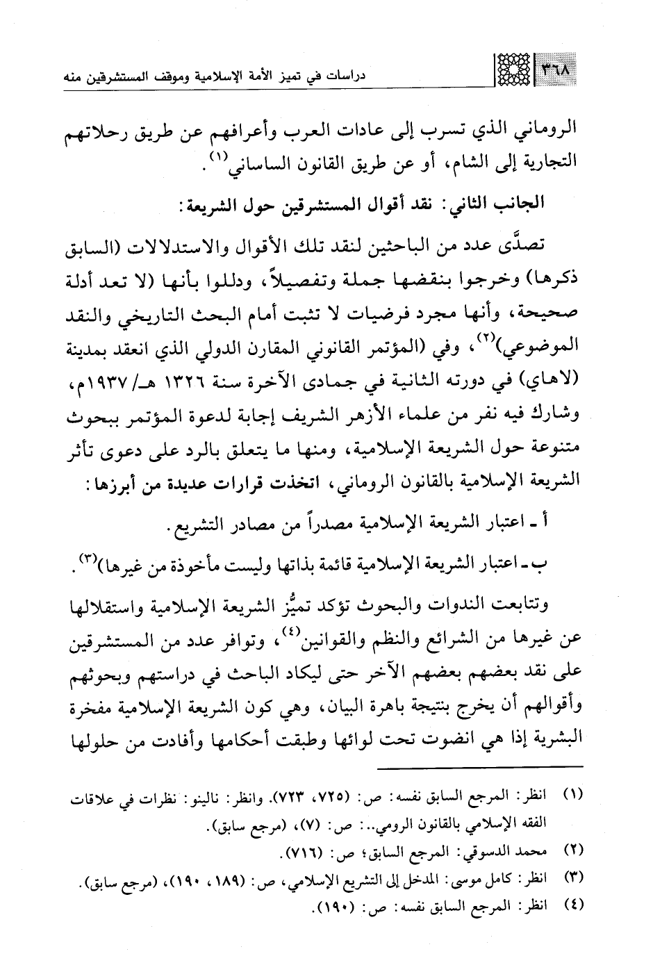 وتتابعت الندوات والبحوث تؤكد تميُّز الشريعة الإسلامية واستقلالها عن غيرها من الشرائع والنظم والقوانين (¬4)، وتوافر عدد من المستشرقين على نقد بعضهم بعضهم الآخر حتى ليكاد الباحث في دراستهم وبحوثهم وأقوالهم أن يخرج بنتيجة باهرة البيان، وهي كون الشريعة الإسلامية مفخرة البشرية إذا هي انضوت تحت لوائها وطبقت أحكامها وأفادت من حلولها