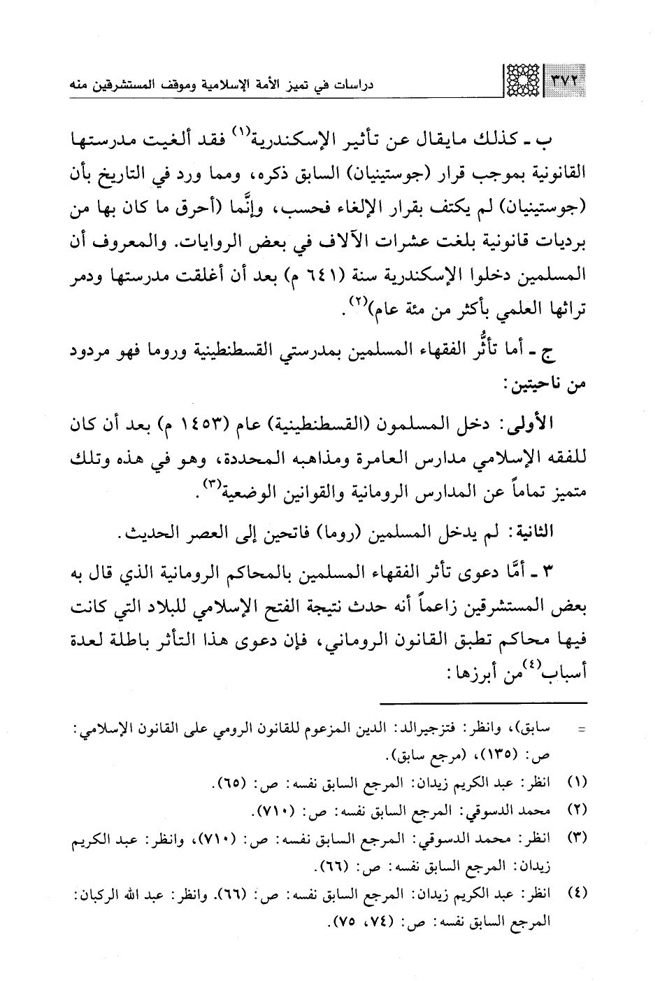 3 - أمَّا دعوى تأثر الفقهاء المسلمين بالمحاكم الرومانية الذي قال به بعض المستشرقين زاعمًا أنه حدث نتيجة الفتح الإسلامي للبلاد التي كانت فيها محاكم تطبق القانون الروماني، فإن دعوى هذا التأثر باطلة لعدة أسباب (¬4) من أبرزها: