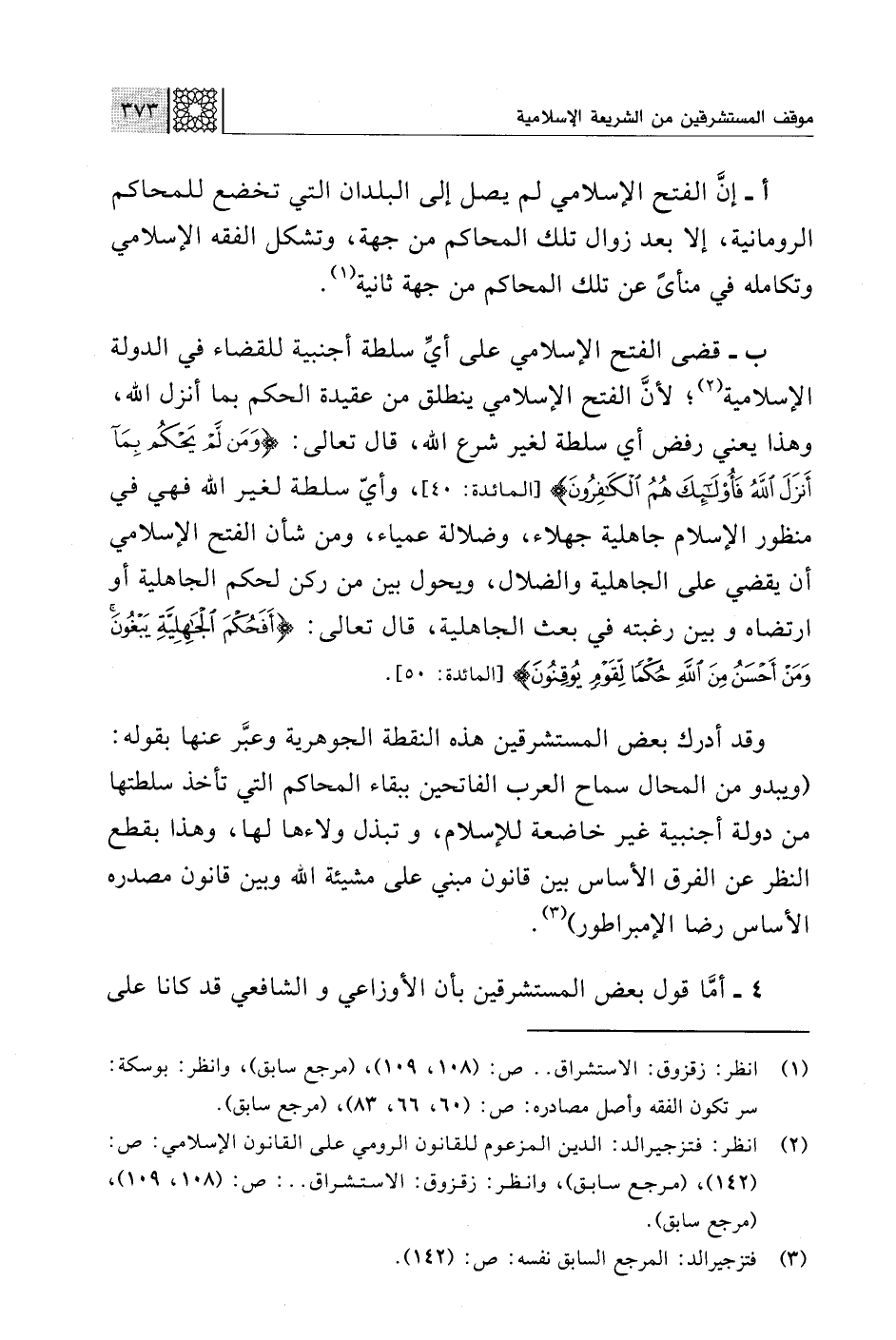 (¬2) انظر: فتزجيرالد: الدين المزعوم للقانون الرومي على القانون الإسلامي: ص: (142)، (مرجع سابق)، وانظر: زقزوق: الاستشراق. .: ص: (108، 109)، (مرجع سابق).