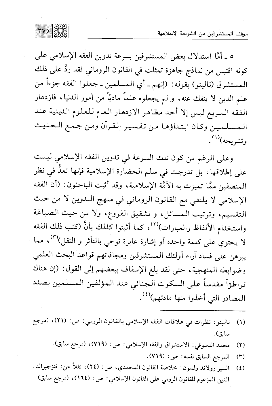 5 - أمَّا استدلال بعض المستشرقين بسرعة تدوين الفقه الإسلامي على كونه اقتبس من نماذج جاهزة تمثلت في القانون الروماني فقد ردَّ على ذلك المستشرق (نالينو) بقوله: (إنهم -أي المسلمين- جعلوا الفقه جزءًا من علم الدين لا ينفك عنه، ولم يجعلوه علمًا ماديًّا من أمور الدنيا، فازدهار الفقه السريع ليس إلا أحد مظاهر الازدهار العام للعلوم الدينية عند المسلمين وكان ابتداؤها من تفسير القرآن ومن جمع الحديث وتشريحه) (¬1).