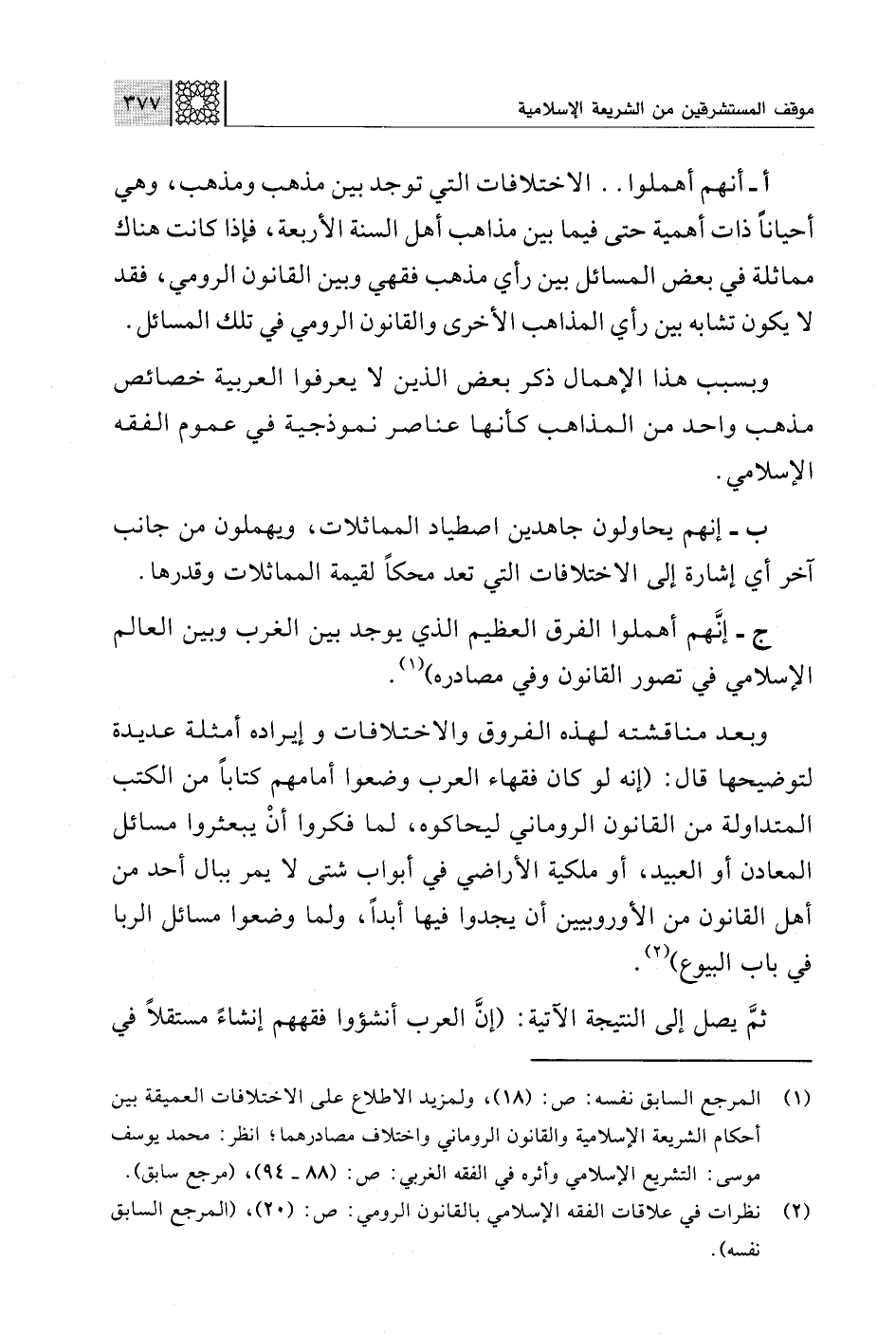 وبعد مناقشته لهذه الفروق والاختلافات وإيراده أمثلة عديدة لتوضيحها قال: (إنه لو كان فقهاء العرب وضعوا أمامهم كتابًا من الكتب المتداولة من القانون الروماني ليحاكوه، لما فكروا أنْ يبعثروا مسائل المعادن أو العبيد، أو ملكية الأراضي في أبواب شتى لا يمر ببال أحد من أهل القانون من الأوروبيين أن يجدوا فيها أبدًا، ولما وضعوا مسائل الربا في باب البيوع) (¬2).
