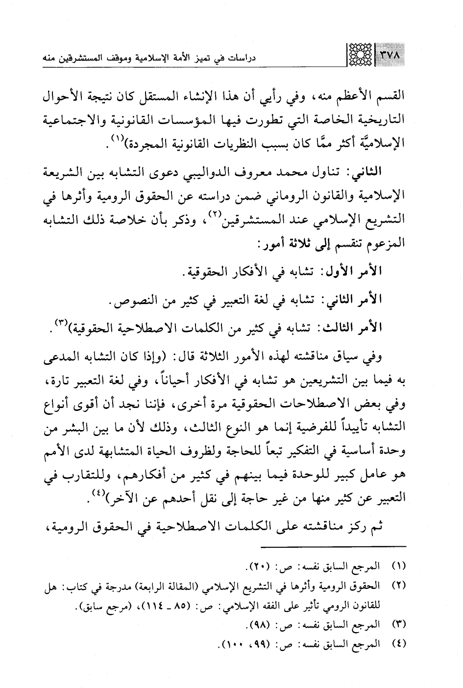 الثاني: تناول محمد معروف الدواليبي دعوى التشابه بين الشريعة الإسلامية والقانون الروماني ضمن دراسته عن الحقوق الرومية وأثرها في التشريع الإسلامي عند المستشرقين (¬2)، وذكر بأن خلاصة ذلك التشابه المزعوم تنقسم إلى ثلاثة أمور: