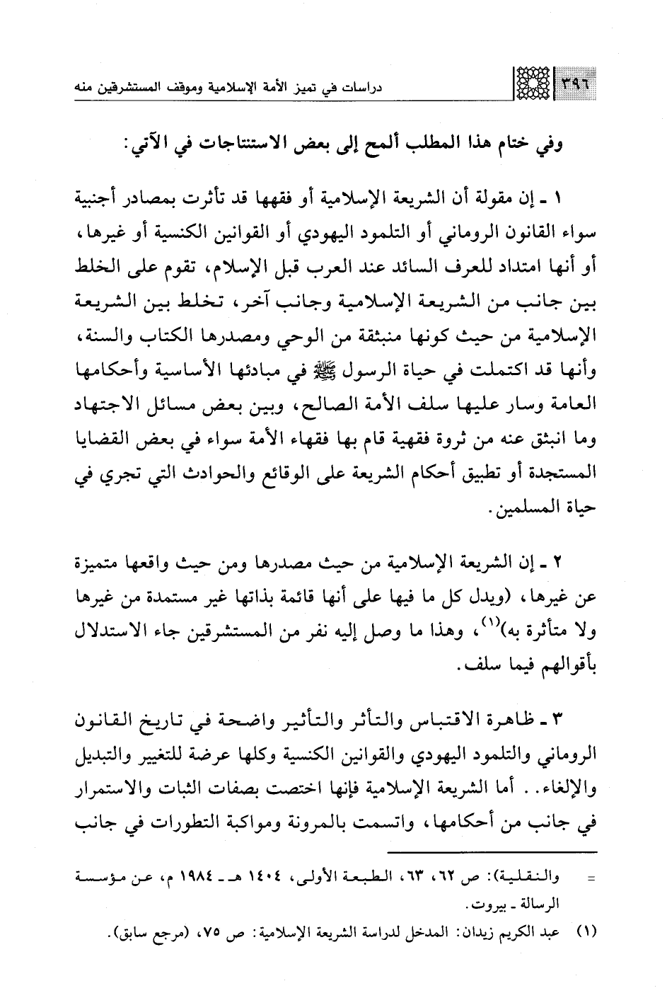 2 - إن الشريعة الإسلامية من حيث مصدرها ومن حيث واقعها متميزة عن غيرها، (ويدل كل ما فيها على أنها قائمة بذاتها غير مستمدة من غيرها ولا متأثرة به) (¬1)، وهذا ما وصل إليه نفر من المستشرقين جاء الاستدلال بأقوالهم فيما سلف.