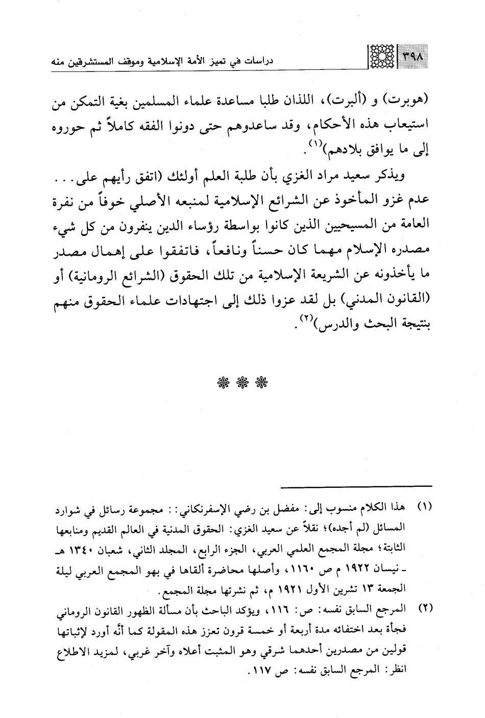 (¬1) هذا الكلام منسوب إلى: مفضل بن رضي الإسفرنكاني: مجموعة رسائل في شوارد المسائل (لم أجده)؛ نقلًا عن سعيد الغزي: الحقوق المدنية في العالم القديم ومنابعها الثابتة؛ مجلة المجمع العلمي العربي، الجزء الرابع، المجلد الثاني، شعبان 1340 هـ - نيسان 1922 م ص 1160، وأصلها محاضرة ألقاها في بهو المجمع العربي ليلة الجمعة 13 تشرين الأول 1921 م، ثم نشرتها مجلة المجمع.