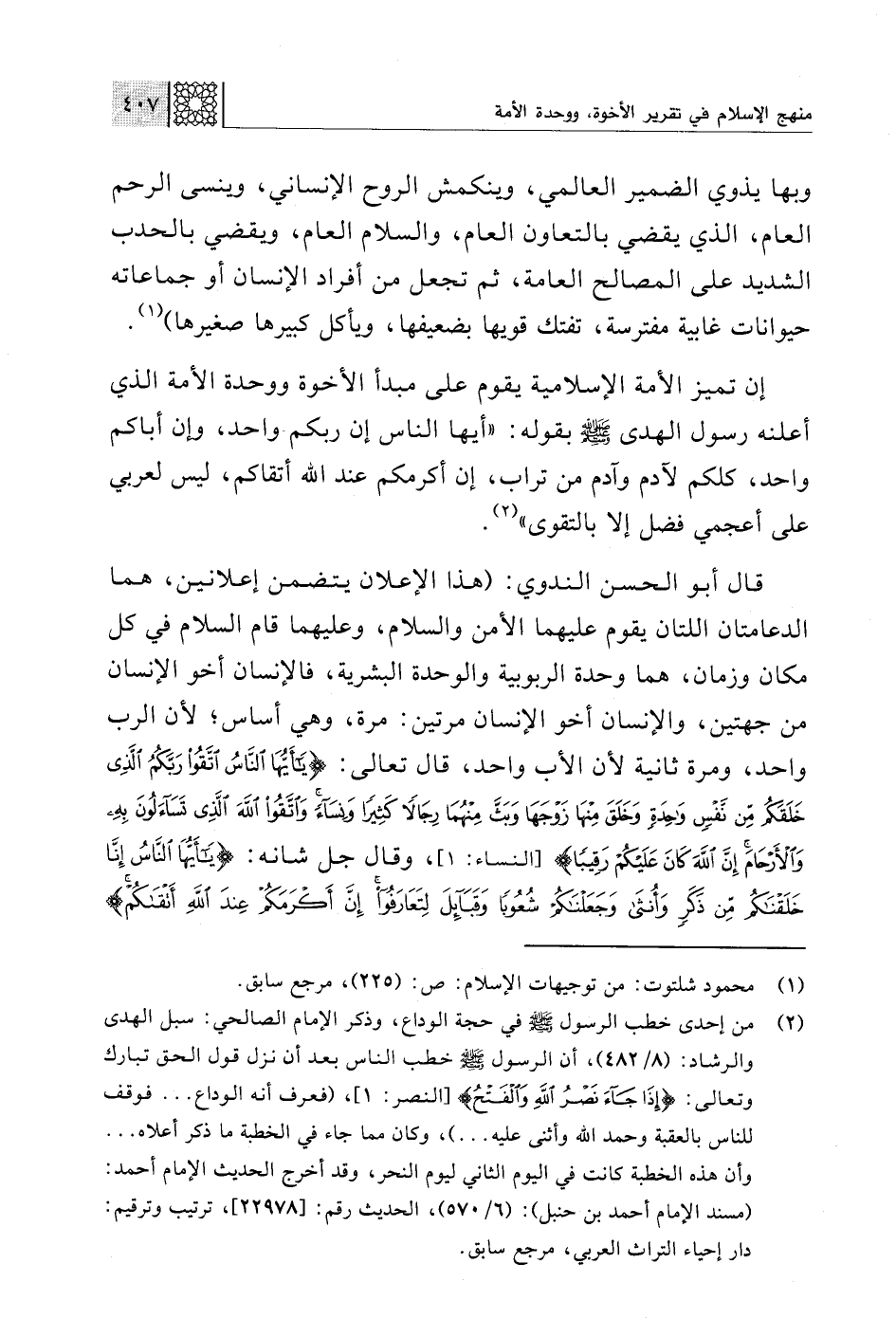 إن تميز الأمة الإسلامية يقوم على مبدأ الأخوة ووحدة الأمة الذي أعلنه رسول الهدى -صلى اللَّه عليه وسلم- بقوله: "أيها الناس إن ربكم واحد، وإن أباكم واحد، كلكم لآدم وآدم من تراب، إن أكرمكم عند اللَّه أتقاكم، ليس لعربي على أعجمي فضل إلا بالتقوى" (¬2).