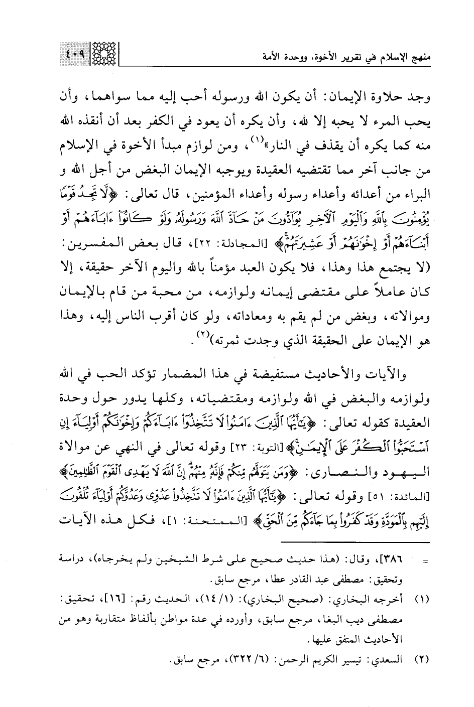 والآيات والأحاديث مستفيضة في هذا المضمار تؤكد الحب في اللَّه ولوازمه والبغض في اللَّه ولوازمه ومقتضياته، وكلها يدور حول وحدة العقيدة كقوله تعالى: {يَاأَيُّهَا الَّذِينَ آمَنُوا لَا تَتَّخِذُوا آبَاءَكُمْ وَإِخْوَانَكُمْ أَوْلِيَاءَ إِنِ اسْتَحَبُّوا الْكُفْرَ عَلَى الْإِيمَانِ} [التوبة: 23] وقوله تعالى في النهي عن موالاة اليهود والنصارى: {وَمَنْ يَتَوَلَّهُمْ مِنْكُمْ فَإِنَّهُ مِنْهُمْ إِنَّ اللَّهَ لَا يَهْدِي الْقَوْمَ الظَّالِمِينَ} [المائدة: 51] وقوله تعالى: {يَاأَيُّهَا الَّذِينَ آمَنُوا لَا تَتَّخِذُوا عَدُوِّي وَعَدُوَّكُمْ أَوْلِيَاءَ تُلْقُونَ إِلَيْهِمْ بِالْمَوَدَّةِ وَقَدْ كَفَرُوا بِمَا جَاءَكُمْ مِنَ الْحَقِّ} [الممتحنة: 1]، فكل هذه الآيات