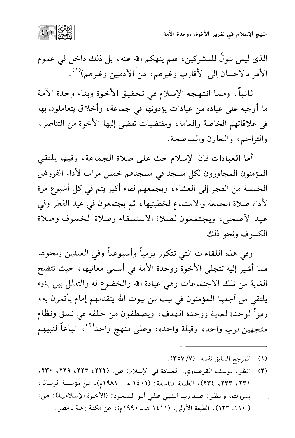 (¬2) انظر: يوسف القرضاوي: العبادة في الإسلام: ص: (222، 223، 229، 230، 231، 233، 234)، الطبعة التاسعة: (1401 هـ - 1981 م)، عن مؤسسة الرسالة، بيروت، وانظر: عبد رب النبي علي أبو السعود: (الأخوة الإسلامية): ص: (110 - 123)، الطبعة الأولى: (1411 هـ - 1990 م)، عن مكتبة وهبة - مصر.
