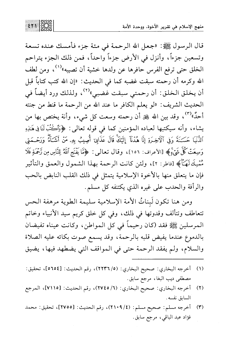 قال الرسول -صلى اللَّه عليه وسلم-: "جعل اللَّه الرحمة في مئة جزء فأمسك عنده تسعة وتسعين جزءًا، وأنزل في الأرض جزءًا واحدًا، فمن ذلك الجزء يتراحم الخلق حتى ترفع الفرس حافرها عن ولدها خشية أن تصيبه" (¬1)، ومن لطف اللَّه وكرمه أن رحمته سبقت غضبه كما في الحديث: "إن اللَّه كتب كتابًا قبل أن يخلق الخلق: أن رحمتي سبقت غضبي" (¬2)، ولذلك ورد أيضًا في الحديث الشريف: "لو يعلم الكافر ما عند اللَّه من الرحمة ما قنط من جنته أحدٌ" (¬3)، وقد بين اللَّه عز وجل أن رحمته وسعت كل شيء، وأنه يختص بها من يشاء، وأنه سيكتبها لعباده المؤمنين كما في قوله تعالى: {وَاكْتُبْ لَنَا فِي هَذِهِ الدُّنْيَا حَسَنَةً وَفِي الْآخِرَةِ إِنَّا هُدْنَا إِلَيْكَ قَالَ عَذَابِي أُصِيبُ بِهِ مَنْ أَشَاءُ وَرَحْمَتِي وَسِعَتْ كُلَّ شَيْءٍ} [الأعراف: 156]، وقال تعالى: {مَا يَفْتَحِ اللَّهُ لِلنَّاسِ مِنْ رَحْمَةٍ فَلَا مُمْسِكَ لَهَا} [فاطر: 2]، ولئن كانت الرحمة بهذا الشمول والعمق والتأثير فإن ما يتعلق منها بالأخوة الإسلامية يتمثل في ذلك القلب النابض بالحب والرأفة والحدب على غيره الذي يكتنفه كل مسلم.