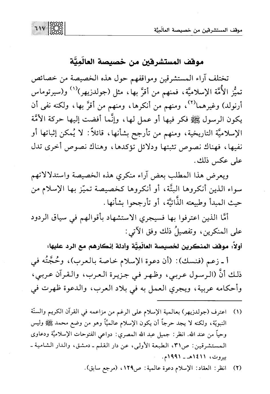 (¬1) اعترف (جولدزيهر) بعالمية الإسلام على الرغم من مزاعمه في القرآن الكريم والسنّة النبويّة، ولكنه لا يجد حرجًا أن يكون الإسلام عالميًا وهو من وضع محمد -صلى اللَّه عليه وسلم- وليس وحيًا من عند اللَّه. انظر: جميل عبد اللَّه المصري: دواعي الفتوحات الإسلاميَّة ودعاوى المستشرقين: ص 31، الطبعة الأولى، عن دار القلم - دمشق، والدار الشامية - بيروت، 1411 هـ - 1991 م.
