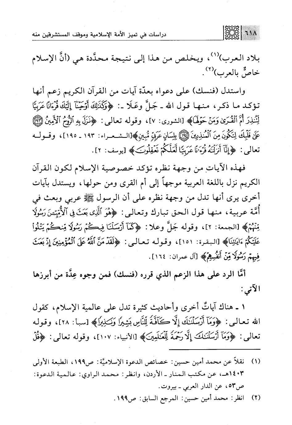 بلاد العرب) (¬1)، ويخلص من هذا إلى نتيجة محدَّدة هي (أنَّ الإسلام خاصٌّ بالعرب) (¬2).