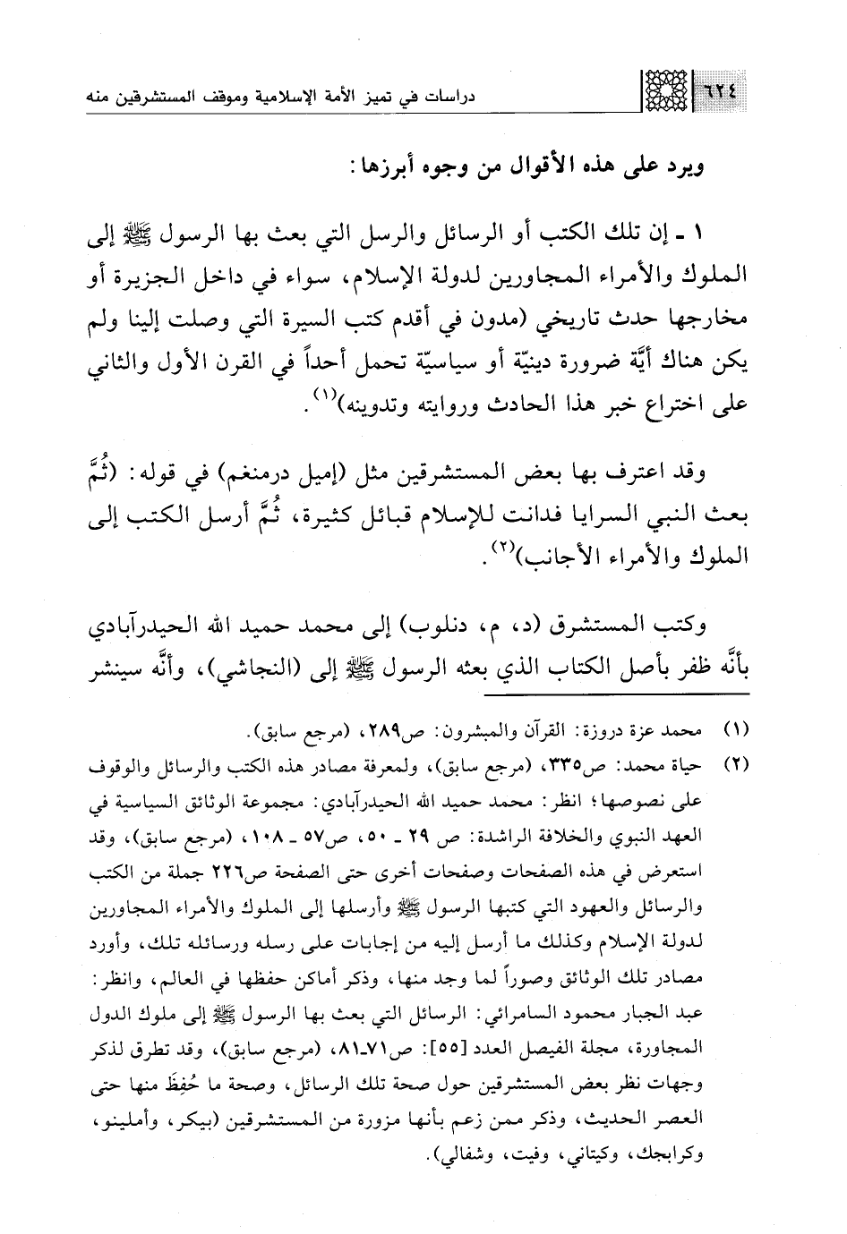(¬2) حياة محمد: ص 335، (مرجع سابق)، ولمعرفة مصادر هذه الكتب والرسائل والوقوف على نصوصها؛ انظر: محمد حميد اللَّه الحيدرآبادي: مجموعة الوثائق السياسية في العهد النبوي والخلافة الراشدة: ص 29 - 50، ص 57 - 108، (مرجع سابق)، وقد استعرض في هذه الصفحات وصفحات أخرى حتى الصفحة ص 226 جملة من الكتب والرسائل والعهود التي كتبها الرسول -صلى اللَّه عليه وسلم- وأرسلها إلى الملوك والأمراء المجاورين لدولة الإسلام وكذلك ما أرسل إليه من إجابات على رسله ورسائله تلك، وأورد مصادر تلك الوثائق وصورًا لما وجد منها، وذكر أماكن حفظها في العالم، وانظر: عبد الجبار محمود السامرائي: الرسائل التي بعث بها الرسول -صلى اللَّه عليه وسلم- إلى ملوك الدول المجاورة، مجلة الفيصل العدد [55]: ص 71 - 81، (مرجع سابق)، وقد تطرق لذكر وجهات نظر بعض المستشرقين حول صحة تلك الرسائل، وصحة ما حُفِظَ منها حتى العصر الحديث، وذكر ممن زعم بأنها مزورة من المستشرقين (بيكر، وأملينو، وكرابجك، وكيتاني، وفيت، وشفالي).