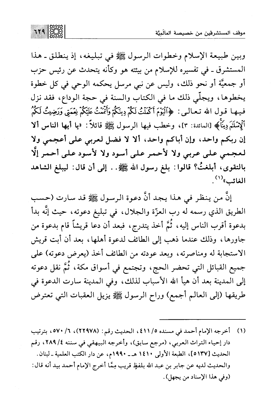 وبين طبيعة الإسلام وخطوات الرسول -صلى اللَّه عليه وسلم- في تبليغه، إذ ينطلق -هذا المستشرق- في تفسيره للإسلام من بيئته هو وكأنه يتحدث عن رئيس حزب أو جمعيَّة أو نحو ذلك، وليس عن نبي مرسل يحكمه الوحي في كل خطوة يخطوها، ويجلّي ذلك ما في الكتاب والسنة في حجة الوداع، فقد نزل فيها قول اللَّه تعالى: {الْيَوْمَ أَكْمَلْتُ لَكُمْ دِينَكُمْ وَأَتْمَمْتُ عَلَيْكُمْ نِعْمَتِي وَرَضِيتُ لَكُمُ الْإِسْلَامَ دِينًا} [المائدة: 3]، وخطب فيها الرسول -صلى اللَّه عليه وسلم- قائلًا: "يا أيها الناس ألا إن ربكم واحد، وإن أباكم واحد، ألا لا فضل لعربي على أعجمي ولا لعجمي على عربي ولا لأحمر على أسود ولا لأسود على أحمر إلَّا بالتقوى، أبلغتُ؟ قالوا: بلغ رسول اللَّه -صلى اللَّه عليه وسلم-. . إلى أن قال: ليبلغ الشاهد الغائب" (¬1).