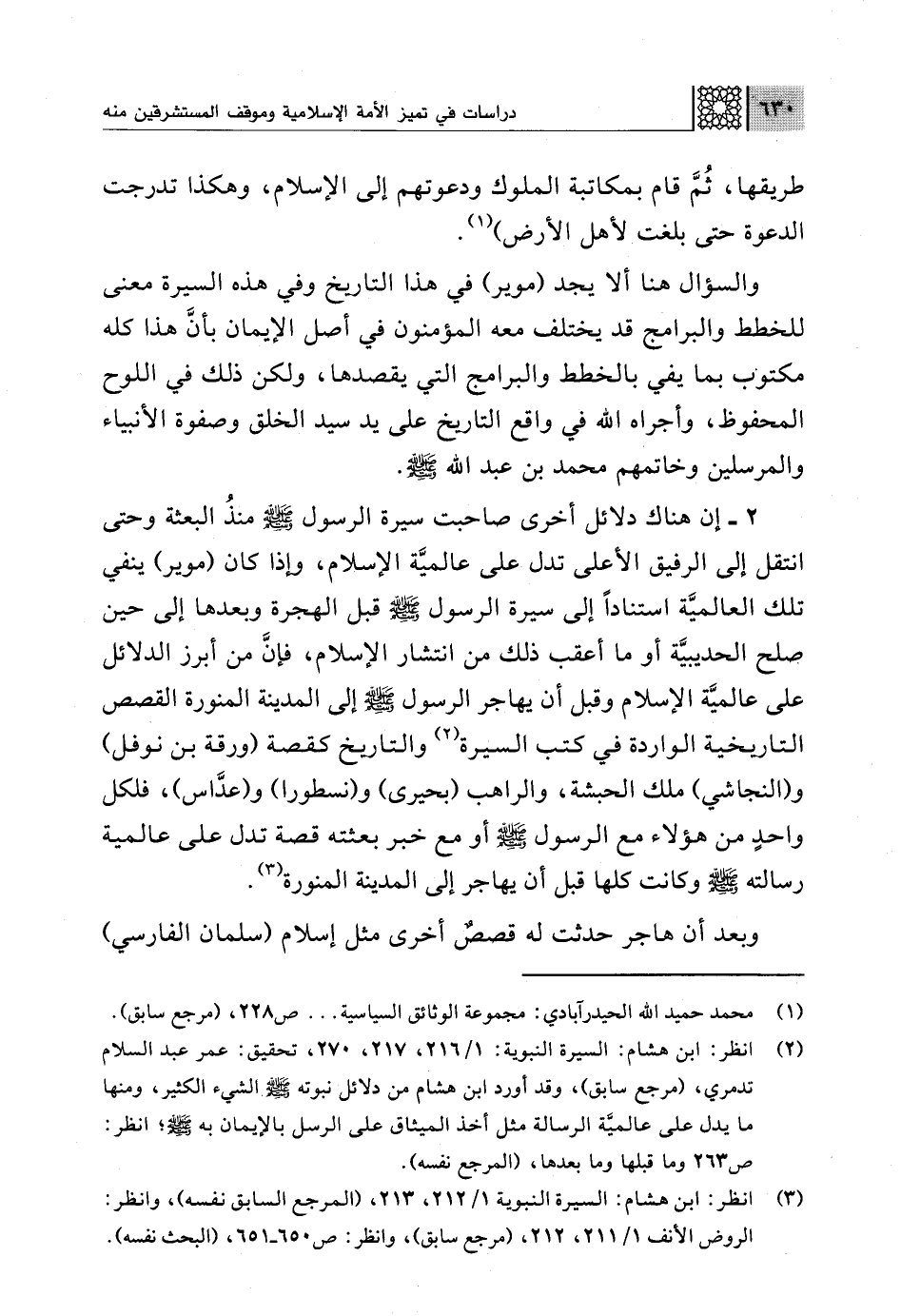 2 - إن هناك دلائل أخرى صاحبت سيرة الرسول -صلى اللَّه عليه وسلم- منذُ البعثة وحتى انتقل إلى الرفيق الأعلى تدل على عالميَّة الإسلام، وإذا كان (موير) ينفي تلك العالميَّة استنادًا إلى سيرة الرسول -صلى اللَّه عليه وسلم- قبل الهجرة وبعدها إلى حين صلح الحديبيَّة أو ما أعقب ذلك من انتشار الإسلام، فإنَّ من أبرز الدلائل على عالميَّة الإسلام وقبل أن يهاجر الرسول -صلى اللَّه عليه وسلم- إلى المدينة المنورة القصص التاريخية الواردة في كتب السيرة (¬2) والتاريخ كقصة (ورقة بن نوفل) و (النجاشي) ملك الحبشة، والراهب (بحيرى) و (نسطورا) و (عدَّاس)، فلكل واحدٍ من هؤلاء مع الرسول -صلى اللَّه عليه وسلم- أو مع خبر بعثته قصة تدل على عالمية رسالته -صلى اللَّه عليه وسلم- وكانت كلها قبل أن يهاجر إلى المدينة المنورة (¬3).