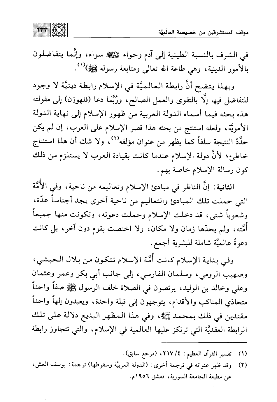 وبهذا يتضح أنَّ رابطة العالميَّة في الإسلام رابطة دينيَّة لا وجود للتفاضل فيها إلَّا بالتقوى والعمل الصالح، ورُبَّمَا دعا (فلهوزن) إلى مقولته هذه بحثه فيما أسماه الدولة العربية من ظهور الإسلام إلى نهاية الدولة الأمويَّة، ولعله استنتج من بحثه هذا قصر الإسلام على العرب، إن لم يكن حدَّدّ النتيجة سلفًا كما يظهر من عنوان مؤلفه (¬2)، ولا شك أن هذا استنتاج خاطئ؛ لأن دولة الإسلام عندما كانت بقيادة العرب لا يستلزم من ذلك كون رسالة الإسلام خاصة بهم.