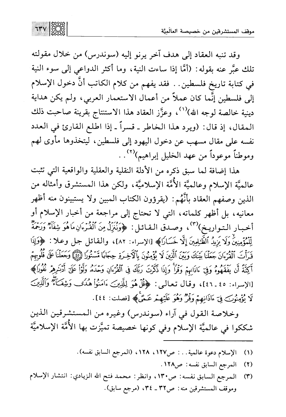 هذا إضافة لما سبق ذكره من الأدلة النقلية والعقلية والواقعية التي تثبت عالميَّة الإسلام وعالميَّة الأُمَّة الإسلاميَّة، ولكن هذا المستشرق وأمثاله من الذين وصفهم العقاد بأنَّهُم: (يقرؤون الكتاب المبين ولا يستبينون منه أظهر معانيه، بل أظهر كلماته، التي لا تحتاج إلى مراجعة من أخبار الإسلام أو أخبار التواريخ) (¬3)، وصدق القائل: {وَنُنَزِّلُ مِنَ الْقُرْآنِ مَا هُوَ شِفَاءٌ وَرَحْمَةٌ لِلْمُؤْمِنِينَ وَلَا يَزِيدُ الظَّالِمِينَ إِلَّا خَسَارًا} [الإسراء: 82]، والقائل جل وعلا: {وَإِذَا قَرَأْتَ الْقُرْآنَ جَعَلْنَا بَيْنَكَ وَبَيْنَ الَّذِينَ لَا يُؤْمِنُونَ بِالْآخِرَةِ حِجَابًا مَسْتُورًا (45) وَجَعَلْنَا عَلَى قُلُوبِهِمْ أَكِنَّةً أَنْ يَفْقَهُوهُ وَفِي آذَانِهِمْ وَقْرًا وَإِذَا ذَكَرْتَ رَبَّكَ فِي الْقُرْآنِ وَحْدَهُ وَلَّوْا عَلَى أَدْبَارِهِمْ نُفُورًا} [الإسراء: 45 - 46]، وقال تعالى: {قُلْ هُوَ لِلَّذِينَ آمَنُوا هُدًى وَشِفَاءٌ وَالَّذِينَ لَا يُؤْمِنُونَ فِي آذَانِهِمْ وَقْرٌ وَهُوَ عَلَيْهِمْ عَمًى} [فصلت: 44].