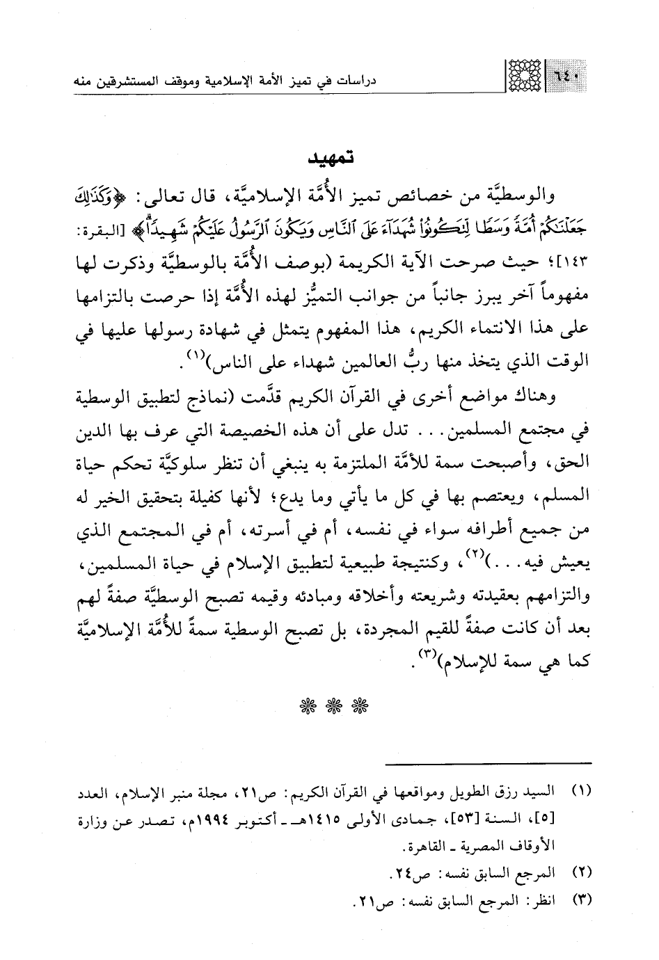 (¬1) السيد رزق الطويل: الوسطية ومواقعها في القرآن الكريم: ص 21، مجلة منبر الإسلام، العدد [5]، السنة [53]، جمادى الأولى 1415 هـ - أكتوبر 1994 م، تصدر عن وزارة الأوقاف المصرية - القاهرة.