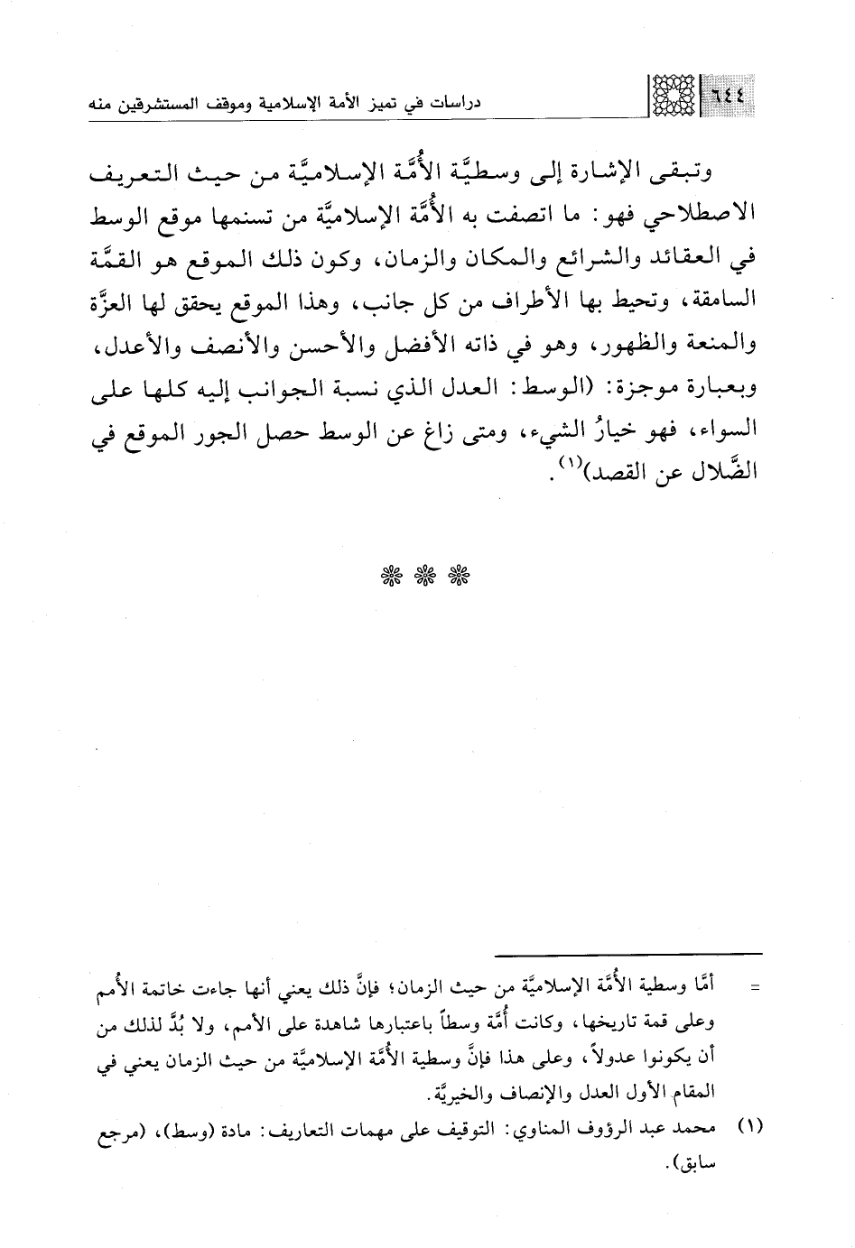 وتبقى الإشارة إلى وسطيَّة الأُمَّة الإسلاميَّة من حيث التعريف الاصطلاحي فهو: ما اتصفت به الأُمَّة الإسلاميَّة من تسنمها موقع الوسط في العقائد والشرائع والمكان والزمان، وكون ذلك الموقع هو القمَّة السامقة، وتحيط بها الأطراف من كل جانب، وهذا الموقع يحقق لها العزَّة والمنعة والظهور، وهو في ذاته الأفضل والأحسن والأنصف والأعدل، وبعبارة موجزة: (الوسط: العدل الذي نسبة الجوانب إليه كلها على السواء، فهو خيارُ الشيء، ومتى زاغ عن الوسط حصل الجور الموقع في الضَّلال عن القصد) (¬1).