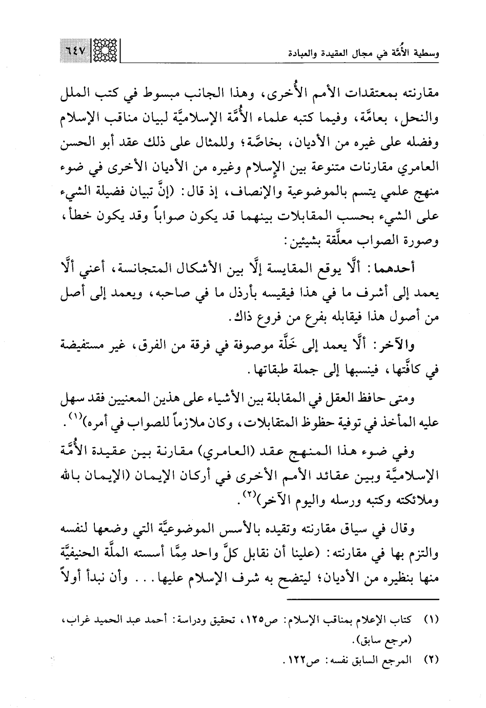 مقارنته بمعتقدات الأمم الأُخرى، وهذا الجانب مبسوط في كتب الملل والنحل، بعامَّة، وفيما كتبه علماء الأُمَّة الإسلاميَّة لبيان مناقب الإسلام وفضله على غيره من الأديان، بخاصَّة؛ وللمثال على ذلك عقد أبو الحسن العامري مقارنات متنوعة بين الإسلام وغيره من الأديان الأخرى في ضوء منهج علمي يتسم بالموضوعية والإنصاف، إذ قال: (إنَّ تبيان فضيلة الشيء على الشيء بحسب المقابلات بينهما قد يكون صوابًا وقد يكون خطأ، وصورة الصواب معلَّقة بشيئين: