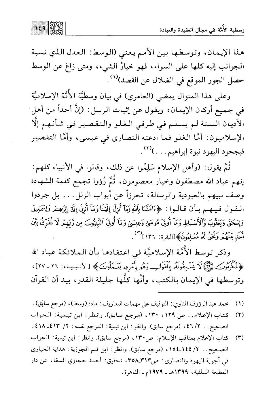 وعلى هذا المنوال يمضي (العامري) في بيان وسطيَّة الأُمَّة الإسلاميَّة في جميع أركان الإيمان، ويقول عن إثبات الرسل: (إنَّ أحدًا من أهل الأديان الستة لم يسلم في طرفي الغلو والتقصير في شأنهم إلَّا الإسلاميون: أمَّا الغلو فما ادعته النصارى في عيسى، وأمَّا التقصير فبجحود اليهود نبوة إبراهيم. . .) (¬2).
