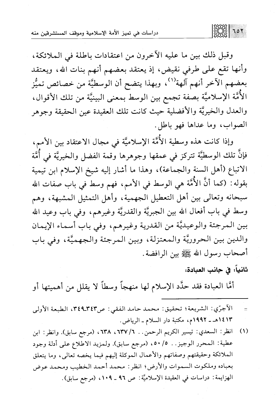وقبل ذلك بين ما عليه الآخرون من اعتقادات باطلة في الملائكة، وأنها تقع على طرفي نقيض، إذ يعتقد بعضهم أنهم بنات اللَّه، ويعتقد بعضهم الآخر أنهم آلهة (¬1)، وبهذا يتضح أن الوسطيَّة من خصائص تميُّز الأُمَّة الإسلاميَّة بصفة تجمع بين الوسط بمعنى البينيَّة من تلك الأقوال، والعدل والخيريَّة والأفضلية حيث كانت تلك العقيدة عين الحقيقة وجوهر الصواب، وما عداها فهو باطل.