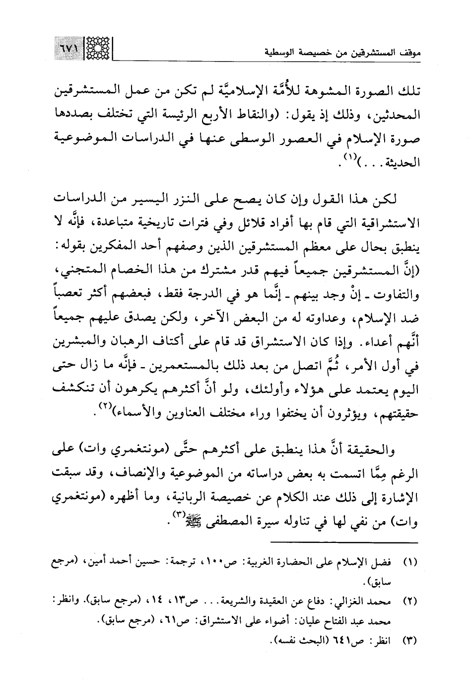 والحقيقة أنَّ هذا ينطبق على أكثرهم حتى (مونتغمري وأت) على الرغم مِمَّا اتسمت به بعض دراساته من الموضوعية والإنصاف، وقد سبقت الإشارة إلى ذلك عند الكلام عن خصيصة الربانية، وما أظهره (مونتغمري وات) من نفي لها في تناوله سيرة المصطفى -صلى اللَّه عليه وسلم- (¬3).
