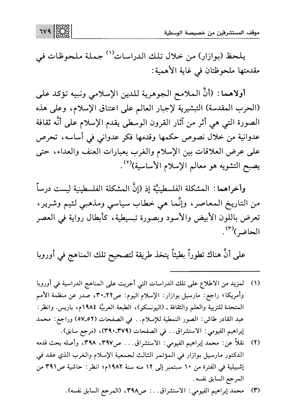(¬2) نقلًا عن: محمد إبراهيم الفيومي: الاستشراق. . . ص 397، 398، وأصله بحث قدمه الدكتور مارسيل بوازار في المؤتمر الثالث لجمعية الإسلام والغرب الذي عقد في إشبيلية في الفترة من 10 سبتمبر إلى 12 منه سنة 1982 م؛ انظر: حاشية ص 391 من المرجع السابق نفسه.