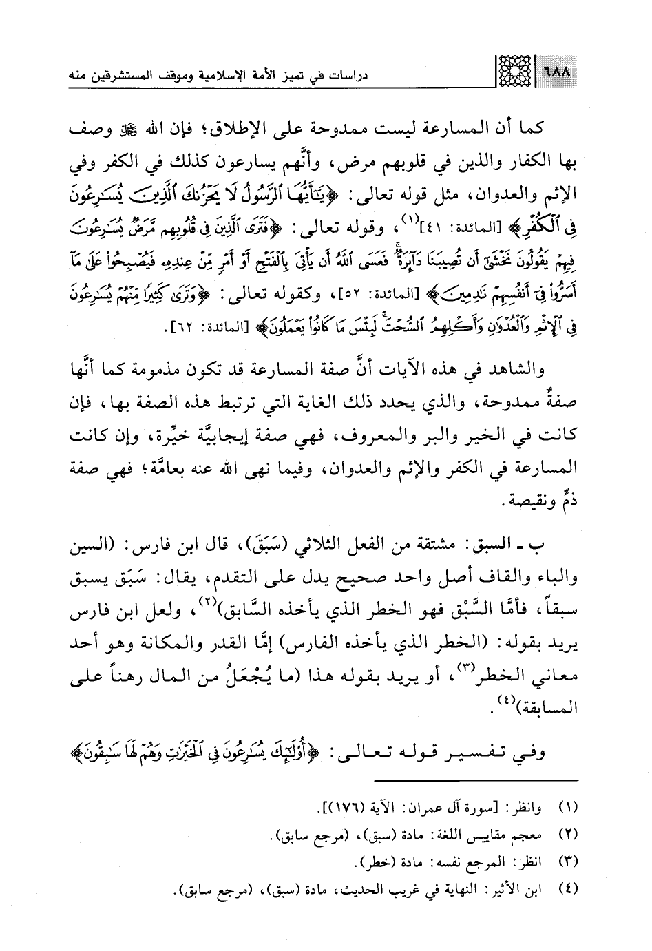 والشاهد في هذه الآيات أنَّ صفة المسارعة قد تكون مذمومة كما أنَّها صفةٌ ممدوحة، والذي يحدد ذلك الغاية التي ترتبط هذه الصفة بها، فإن كانت في الخير والبر والمعروف، فهي صفة إيجابيَّة خيِّرة، وإن كانت المسارعة في الكفر والإثم والعدوان، وفيما نهى اللَّه عنه بعامَّة؛ فهي صفة ذمٍّ ونقيصة.