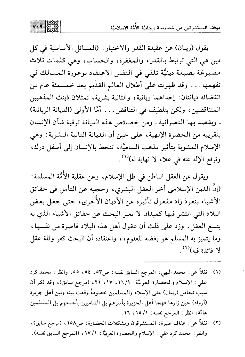 (¬1) نقلًا عن: محمد البهي: المرجع السابق نفسه: ص 53، 54، 55، وانظر: محمد كرد علي: الإسلام والحضارة العربيَّة: 1/ 16، 17، 21، (مرجع سابق)، وقد ذكر أن سبب تحامل (رينان) على الإسلام والمسلمين خصومة وقعت بينه وبين أهل جزيرة (أرواد) حين زارها فهجا أهل الجزيرة بأسرهم بل الشاميين بأجمعهم بل المسلمين عامَّة، انظر: المرجع نفسه: 1/ 15، 16.