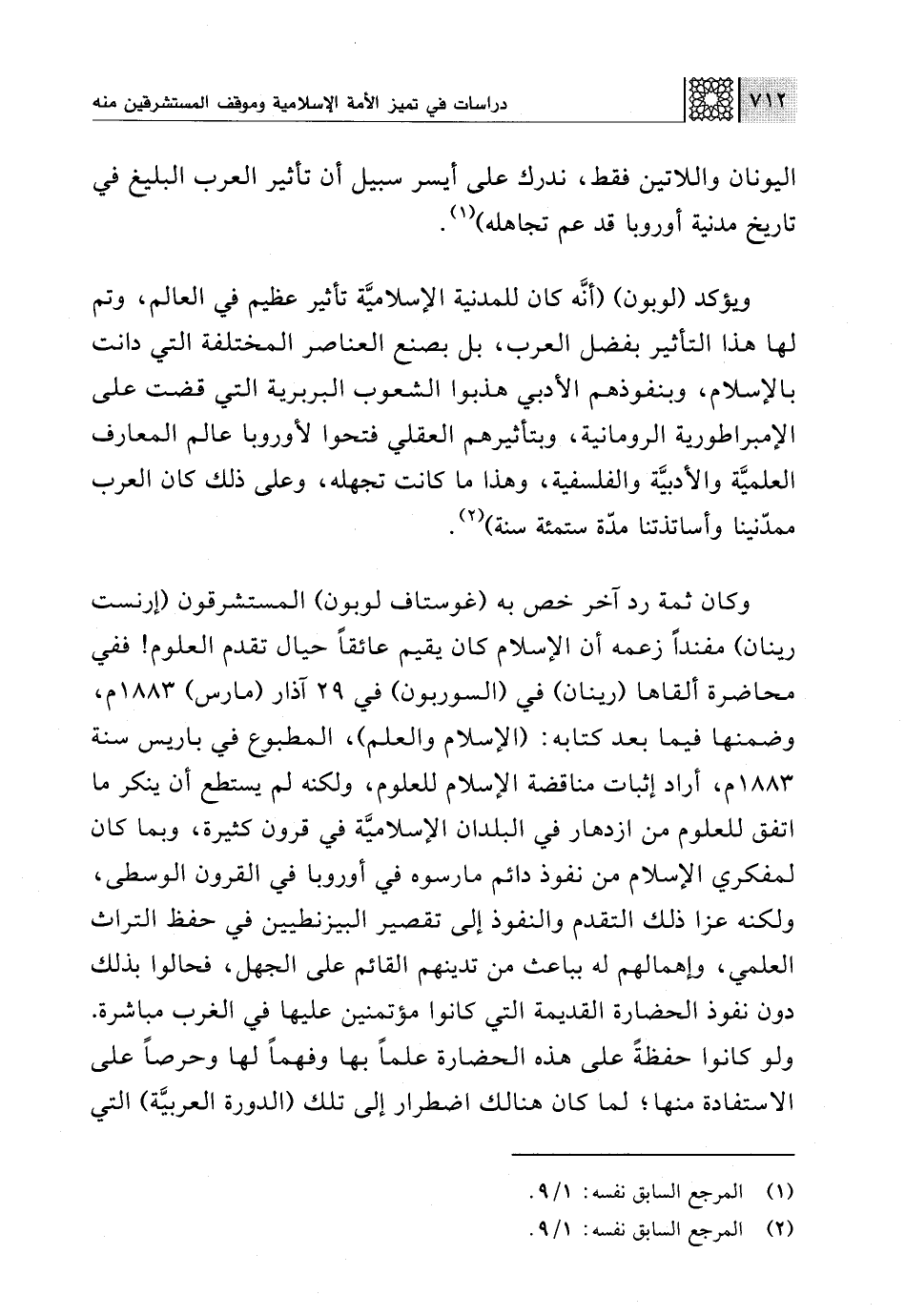 اليونان واللاتين فقط، ندرك على أيسر سبيل أن تأثير العرب البليغ في تاريخ مدنية أوروبا قد عم تجاهله) (¬1).