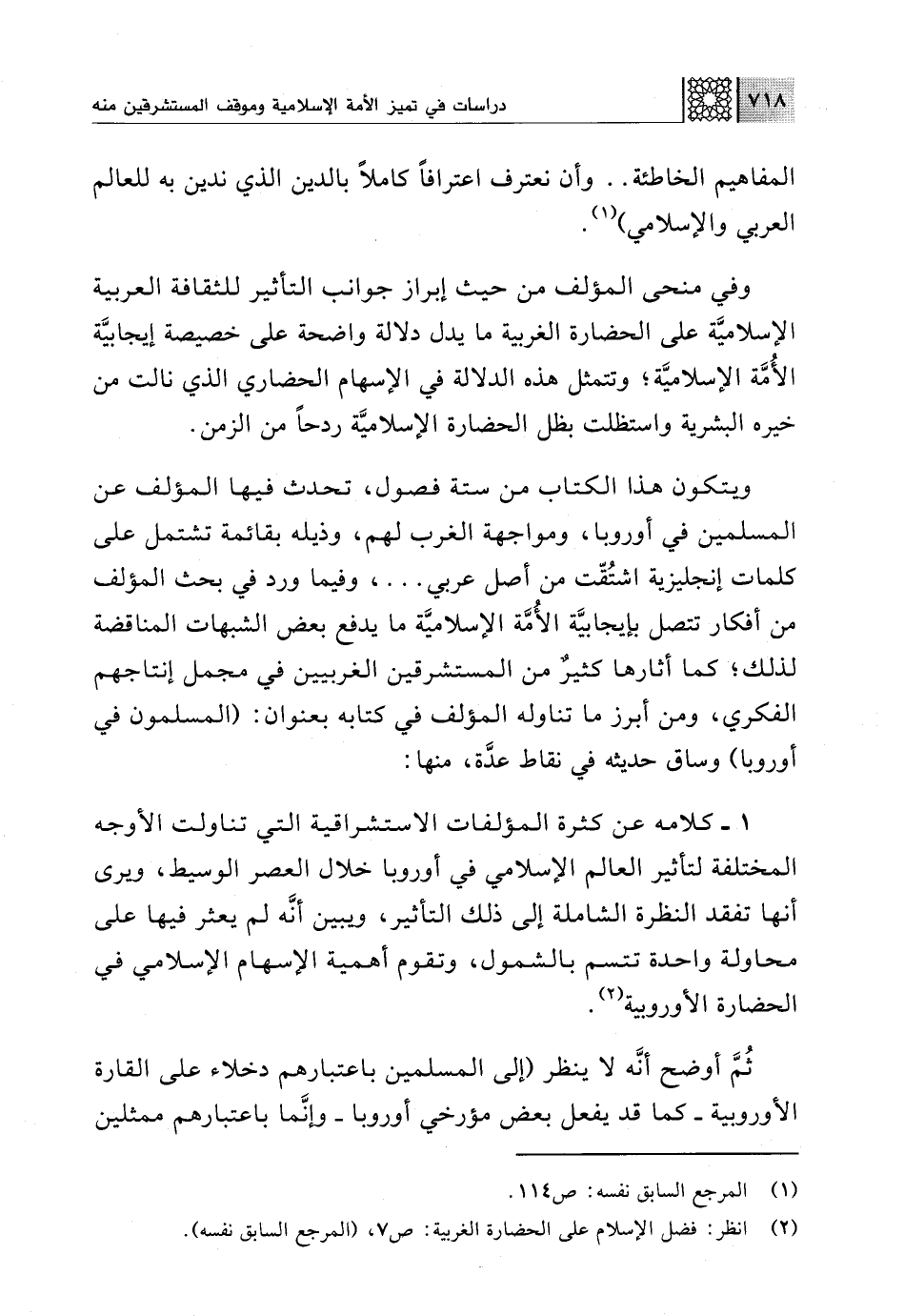 1 - كلامه عن كثرة المؤلفات الاستشراقية التي تناولت الأوجه المختلفة لتأثير العالم الإسلامي في أوروبا خلال العصر الوسيط، ويرى أنها تفقد النظرة الشاملة إلى ذلك التأثير، ويبين أنَّه لم يعثر فيها على محاولة واحدة تتسم بالشمول، وتقوم أهمية الإسهام الإسلامي في الحضارة الأوروبية (¬2).