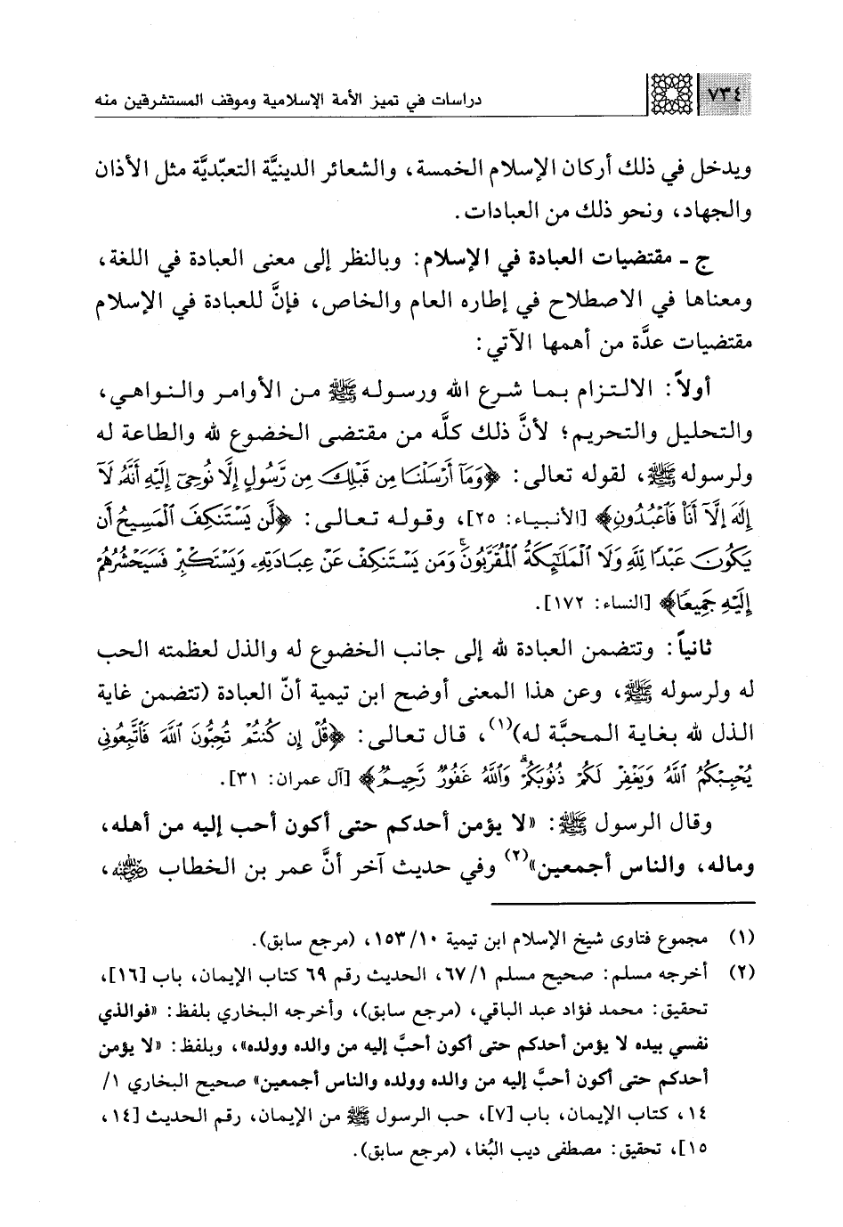 ثانيًا: وتتضمن العبادة للَّه إلى جانب الخضوع له والذل لعظمته الحب له ولرسوله -صلى اللَّه عليه وسلم-، وعن هذا المعنى أوضح ابن تيمية أنّ العبادة (تتضمن غاية الذل للَّه بغاية المحبَّة له) (¬1)، قال تعالى: {قُلْ إِنْ كُنْتُمْ تُحِبُّونَ اللَّهَ فَاتَّبِعُونِي يُحْبِبْكُمُ اللَّهُ وَيَغْفِرْ لَكُمْ ذُنُوبَكُمْ وَاللَّهُ غَفُورٌ رَحِيمٌ} [آل عمران: 31].