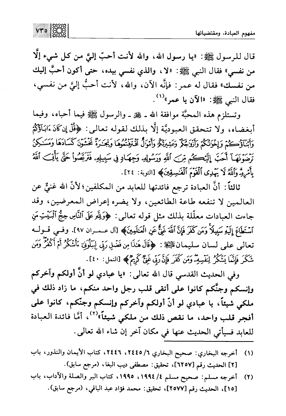وتستلزم هذه المحبَّة موافقة اللَّه -عز وجل- والرسول -صلى اللَّه عليه وسلم- فيما أحباه، وفيما أبغضاه، ولا تتحقق العبوديَّة إلَّا بذلك لقوله تعالى: {قُلْ إِنْ كَانَ آبَاؤُكُمْ وَأَبْنَاؤُكُمْ وَإِخْوَانُكُمْ وَأَزْوَاجُكُمْ وَعَشِيرَتُكُمْ وَأَمْوَالٌ اقْتَرَفْتُمُوهَا وَتِجَارَةٌ تَخْشَوْنَ كَسَادَهَا وَمَسَاكِنُ تَرْضَوْنَهَا أَحَبَّ إِلَيْكُمْ مِنَ اللَّهِ وَرَسُولِهِ وَجِهَادٍ فِي سَبِيلِهِ فَتَرَبَّصُوا حَتَّى يَأْتِيَ اللَّهُ بِأَمْرِهِ وَاللَّهُ لَا يَهْدِي الْقَوْمَ الْفَاسِقِينَ} [التوبة: 24].