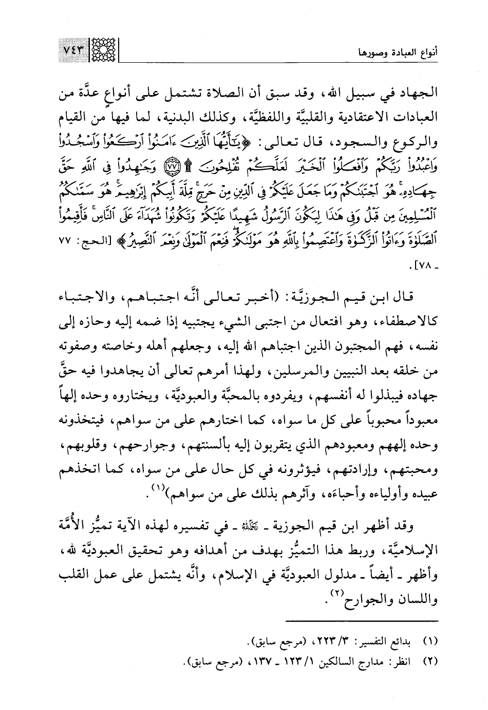 الجهاد في سبيل اللَّه، وقد سبق أن الصلاة تشتمل على أنواعٍ عدَّة من العبادات الاعتقادية والقلبيَّة واللفظيَّة، وكذلك البدنية، لما فيها من القيام والركوع والسجود، قال تعالى: {يَاأَيُّهَا الَّذِينَ آمَنُوا ارْكَعُوا وَاسْجُدُوا وَاعْبُدُوا رَبَّكُمْ وَافْعَلُوا الْخَيْرَ لَعَلَّكُمْ تُفْلِحُونَ (77) وَجَاهِدُوا فِي اللَّهِ حَقَّ جِهَادِهِ هُوَ اجْتَبَاكُمْ وَمَا جَعَلَ عَلَيْكُمْ فِي الدِّينِ مِنْ حَرَجٍ مِلَّةَ أَبِيكُمْ إِبْرَاهِيمَ هُوَ سَمَّاكُمُ الْمُسْلِمِينَ مِنْ قَبْلُ وَفِي هَذَا لِيَكُونَ الرَّسُولُ شَهِيدًا عَلَيْكُمْ وَتَكُونُوا شُهَدَاءَ عَلَى النَّاسِ فَأَقِيمُوا الصَّلَاةَ وَآتُوا الزَّكَاةَ وَاعْتَصِمُوا بِاللَّهِ هُوَ مَوْلَاكُمْ فَنِعْمَ الْمَوْلَى وَنِعْمَ النَّصِيرُ (78)} [الحج: 77 - 78].