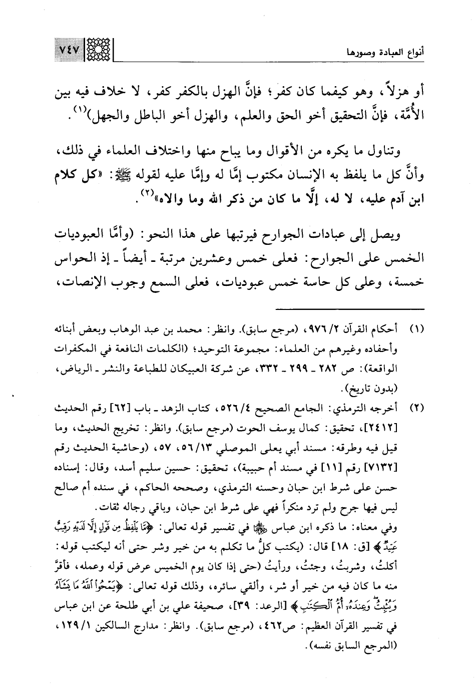 ويصل إلى عبادات الجوارح فيرتبها على هذا النحو: (وأمَّا العبوديات الخمس على الجوارح: فعلى خمس وعشرين مرتبة -أيضًا- إذ الحواس خمسة، وعلى كل حاسة خمس عبوديات، فعلى السمع وجوب الإنصات،