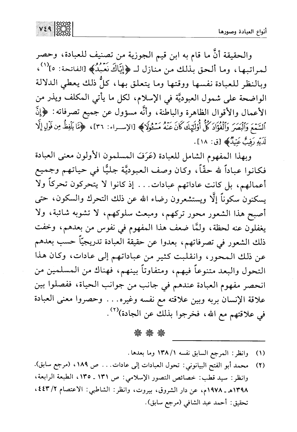 (¬2) محمد أبو الفتح البيانوني: تحول العبادات إلى عادات. . . ص 189، (مرجع سابق). وانظر: سيد قطب: خصائص التصور الإسلامي: ص 131 - 135، الطبعة الرابعة، 1398 هـ - 1978 م، عن دار الشروق، بيروت، وانظر: الشاطبي: الاعتصام 2/ 443، تحقيق: أحمد عبد الشافي (مرجع سابق).