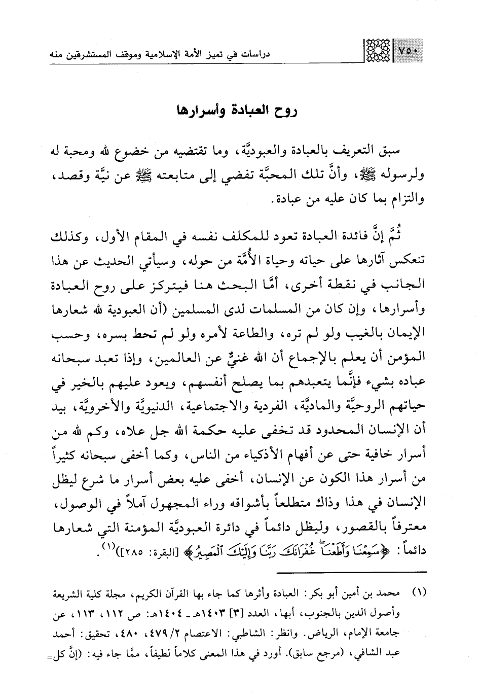 (¬1) محمد بن أمين أبو بكر: العبادة وأثرها كما جاء بها القرآن الكريم، مجلة كلية الشريعة وأصول الدين بالجنوب، أبها، العدد [3] 1403 هـ - 1404 هـ: ص 112، 113، عن جامعة الإمام، الرياض. وانظر: الشاطبي: الاعتصام 2/ 479، 480، تحقيق: أحمد عبد الشافي، (مرجع سابق). أورد في هذا المعنى كلامًا لطيفًا، ممَّا جاء فيه: (إنَّ كل =