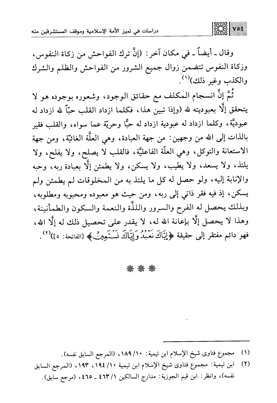 (¬2) ابن تيمية: مجموع فتاوى شيخ الإسلام ابن تيمية 10/ 194، 193، (المرجع السابق نفسه)، وانظر: ابن قيم الجوزية: مدارج السالكين 1/ 463 - 465، (مرجع سابق).