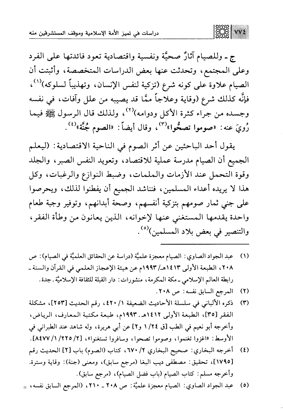 (¬1) عبد الجواد الصاوي: الصيام معجزة علميَّة (دراسة عن الحقائق العلميَّة في الصيام): ص 208، الطبعة الأولى 1413 هـ / 1993 م عن هيئة الإعجاز العلمي في القرآن والسنة - رابطة العالم الإسلامي - مكة المكرمة، منشورات: دار القبلة للثقافة الإسلاميَّة. جدة.