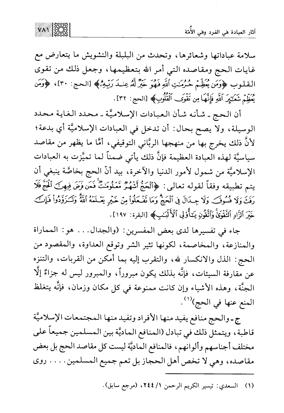 سلامة عباداتها وشعائرها، وتحدث من البلبلة والتشويش ما يتعارض مع غايات الحج ومقاصده التي أمر اللَّه بتعظيمها، وجعل ذلك من تقوى القلوب {وَمَنْ يُعَظِّمْ حُرُمَاتِ اللَّهِ فَهُوَ خَيْرٌ لَهُ عِنْدَ رَبِّهِ} [الحج: 30]، {وَمَنْ يُعَظِّمْ شَعَائِرَ اللَّهِ فَإِنَّهَا مِنْ تَقْوَى الْقُلُوبِ} [الحج: 32].