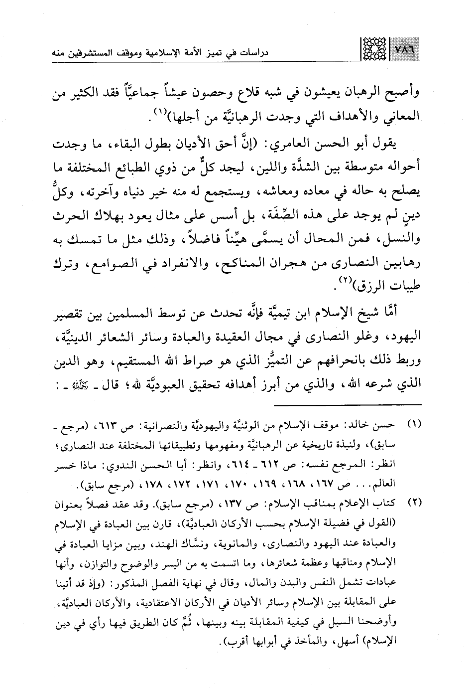 يقول أبو الحسن العامري: (إنَّ أحق الأديان بطول البقاء، ما وجدت أحواله متوسطة بين الشدَّة واللين، ليجد كلٌّ من ذوي الطبائع المختلفة ما يصلح به حاله في معاده ومعاشه، ويستجمع له منه خير دنياه وآخرته، وكلُّ دينٍ لم يوجد على هذه الصِّفَة، بل أسس على مثال يعود بهلاك الحرث والنسل، فمن المحال أن يسمَّى هيِّنًا فاضلًا، وذلك مثل ما تمسك به رهابين النصارى من هجران المناكح، والانفراد في الصوامع، وترك طيبات الرزق) (¬2).