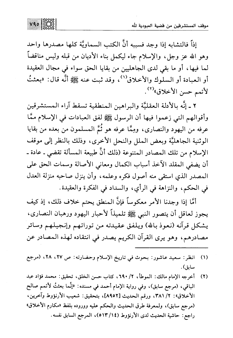 2 - إنَّه بالأدلة العقليَّة والبراهين المنطقية تسقط آراء المستشرقين وأقوالهم التي زعموا فيها أن الرسول -صلى اللَّه عليه وسلم- لفق العبادات في الإسلام ممَّا عرفه من اليهود والنصارى، ومِمَّا عرفه هو ثُمَّ المسلمون من بعده من بقايا الوثنية الجاهليَّة وبعض الملل والنحل الأخرى، وذلك بالنظر إلى موقف الإسلام من تلك المصادر المتنوعة (ذلك أنَّ طبيعة المسألة تقضي -عادة- أن يضفي المقلد الآخذ أسباب الكمال ومعاني الأصالة وسمات الحق على المصدر الذي استقى منه أصول فكره وعلمه، وأن ينزل صاحبه منزلة العدل في الحكم، والنزاهة في الرأي، والسداد في الفكرة والعقيدة.